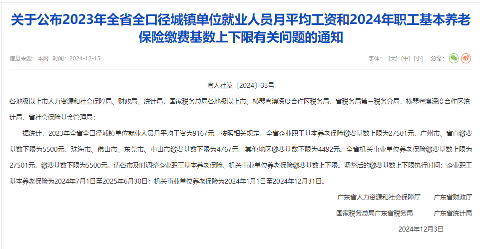 廣東發(fā)布2024年職工基本養(yǎng)老保險(xiǎn)繳費(fèi)基數(shù)上下限