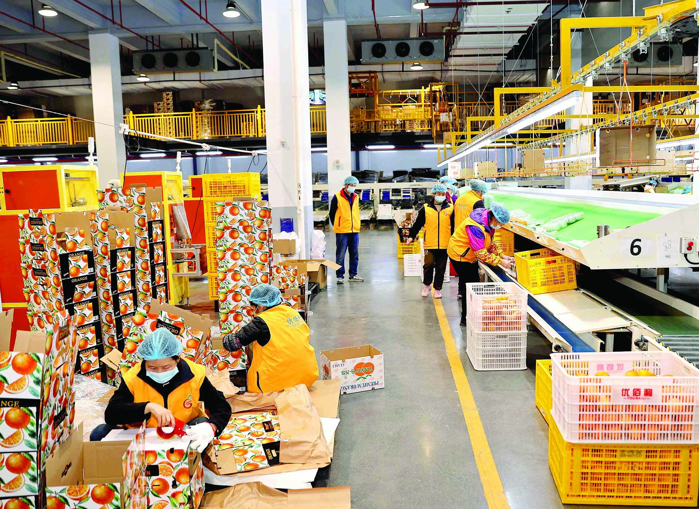 在粵港澳大灣區(qū)(廣東·惠州)綠色農(nóng)產(chǎn)品生產(chǎn)供應(yīng)基地,工人們打包新鮮橘子準(zhǔn)備發(fā)貨。 惠州日?qǐng)?bào)記者李松權(quán) 攝