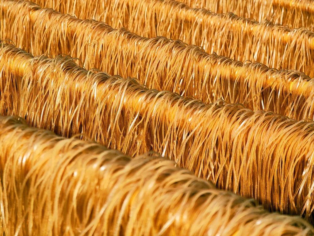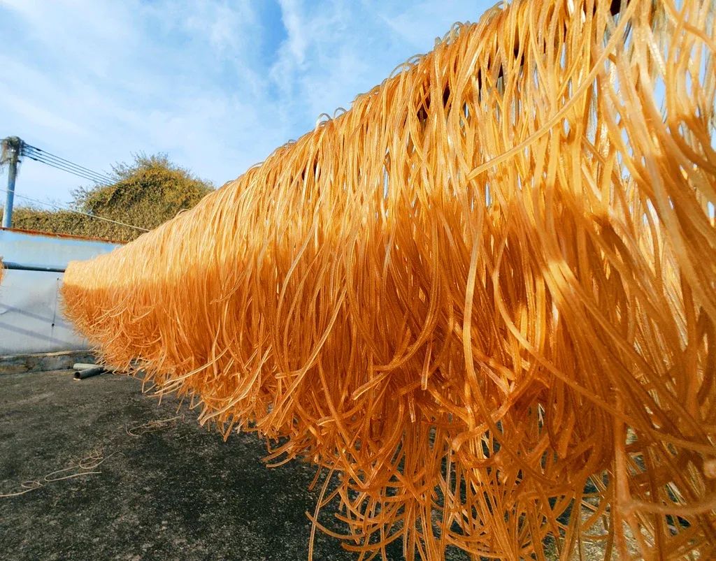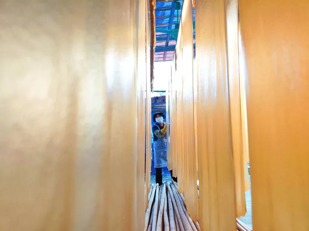 粉皮晾曬四五個(gè)小時(shí)左右,才能用機(jī)器切成絲,接著晾曬兩天。