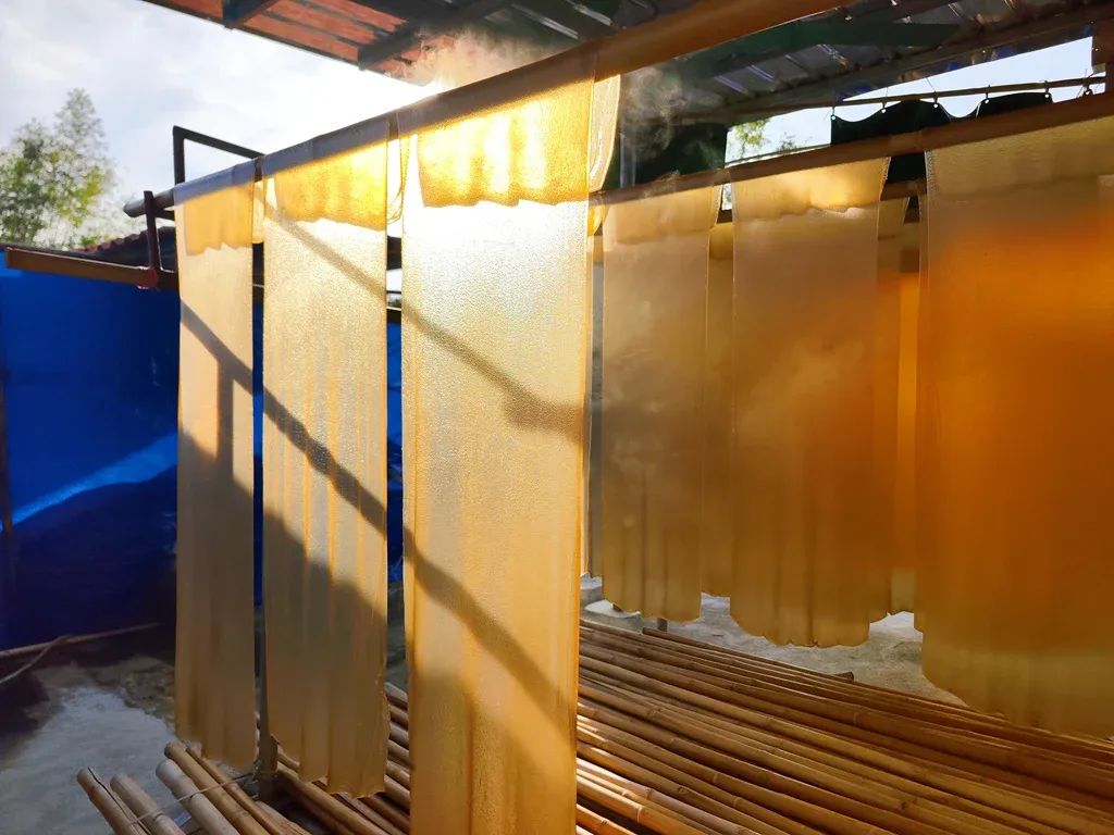 剛制作好的粉皮在陽光中晾曬,晶瑩剔透。
