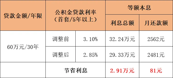 以當(dāng)前我市普通職工家庭首套住房最高貸款60萬為例,貸款年限30年,采用等額本息還款方式,在利率調(diào)整后,總利息減少2.91萬元,每月還款額可減少81元。