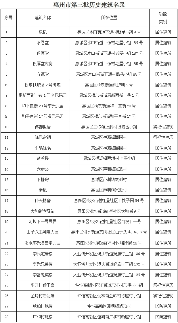 此前,惠州市人民政府分別于2013年4月、2018年7月公布了兩批歷史建筑名錄,第一批202處,第二批29處。惠州市各縣區(qū)亦開展多輪歷史建筑普查認定,目前惠州共有歷史建筑293處。