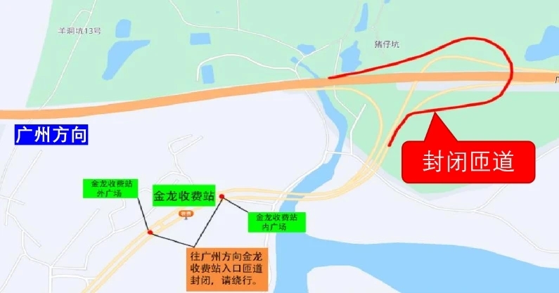 金龍收費站往廣州方向入口匝道封閉示意圖。