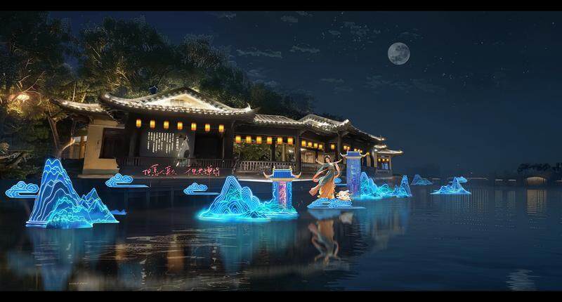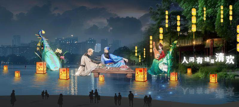 燈組“千年之約”場景設(shè)計來源于蘇東坡寓惠兩年多對惠州巨大的貢獻,充分利用東坡、朝云、亭山樓閣等元素,營造出“天上宮闕”般的場景,如夢如幻仿佛穿越時空回到一千年前,與東坡有個跨越時空的約定。