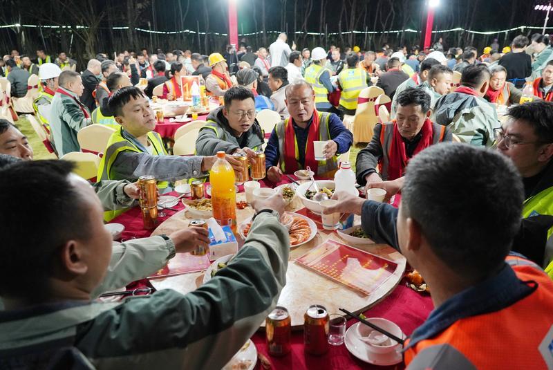 一線建設(shè)者圍坐一堂,共享節(jié)日歡愉;葜萑請笥浾咧旖鹳 攝