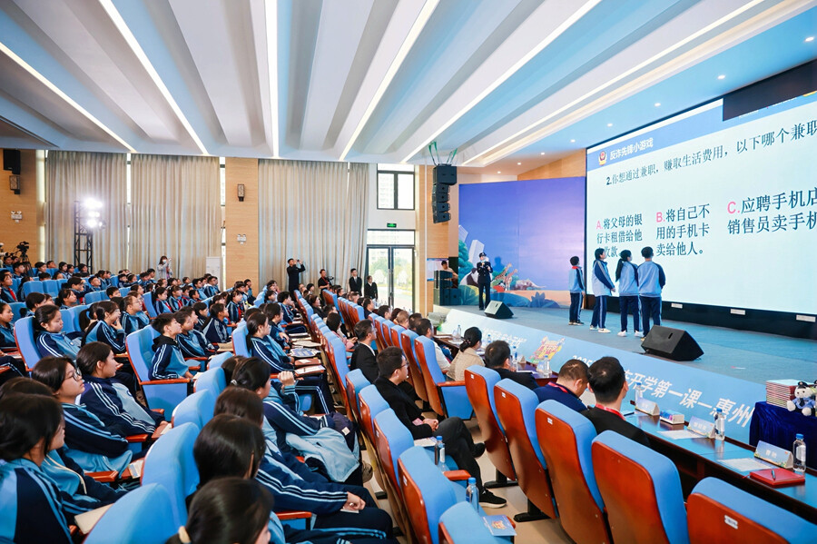 惠州日報訊 (記者葉麗莎 通訊員金易里)2月13日上午,由廣東省教育廳、廣東省市場監(jiān)督管理局、中共惠州市委政法委員會、惠州市教育局、惠州市公安局、惠州市市場監(jiān)督管理局、惠州市消防救援支隊聯(lián)合指導,廣東經(jīng)濟科教頻道主辦,惠州市反詐中心等4家單位聯(lián)合協(xié)辦,市校園安全教育與管理服務(wù)協(xié)會等7家單位聯(lián)合支持的2025“廣東開學第一課”(春季)——惠州專場活動在惠陽區(qū)第五中學及附屬小學舉行,現(xiàn)場吸引了該校全體師生以及周邊學校部分師生代表參與。