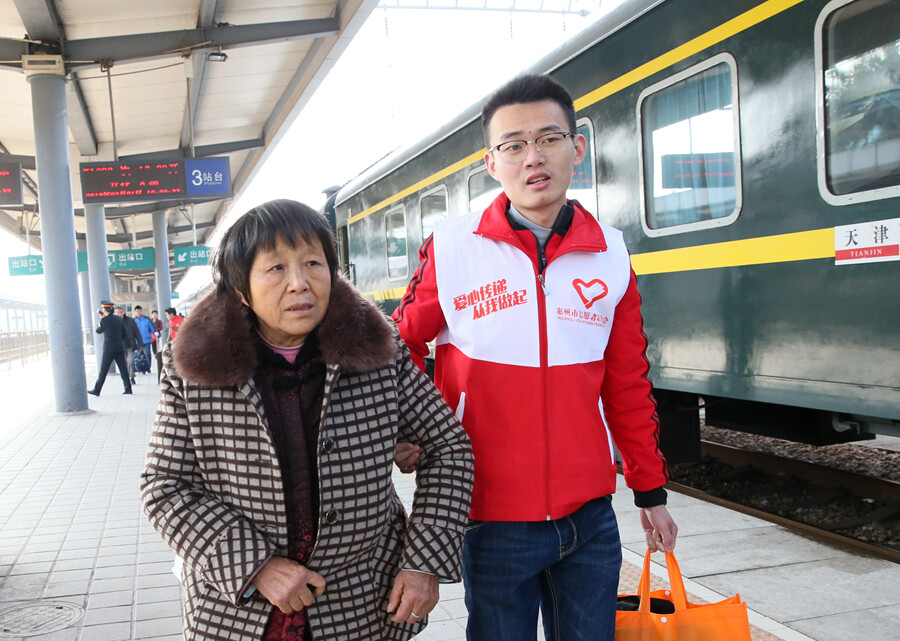 志愿者在惠州火車站幫助乘客。惠州日報記者鐘暢新 攝