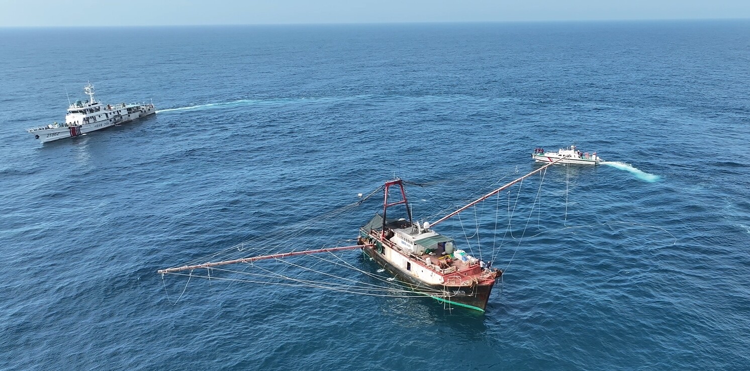 經(jīng)過近1小時的追擊,在與趕來增援的執(zhí)法艇攔截合圍下,嫌疑船舶被成功截停。經(jīng)查發(fā)現(xiàn),船上共有嫌疑人員10名,在執(zhí)法人員全程拍攝取證下,嫌疑人對非法捕撈的違法事實供認不諱。