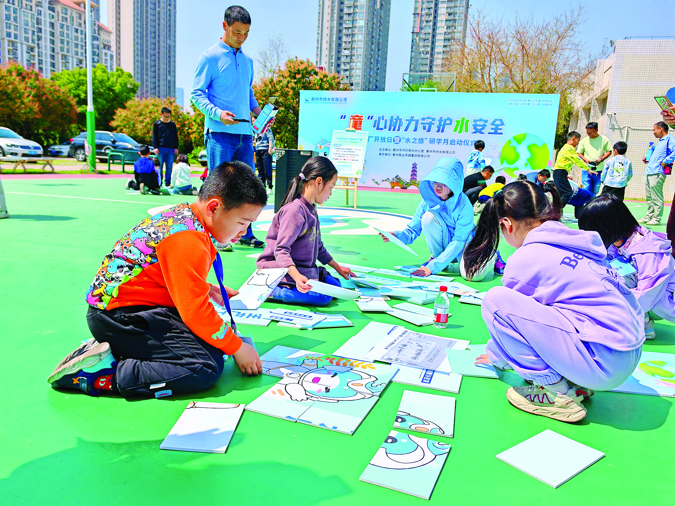 趣味十足的活動(dòng)輪番上演。在燦爛的陽(yáng)光下,孩子們興致勃勃地參與水廠生產(chǎn)工藝拼圖游戲,F(xiàn)場(chǎng),工作人員將孩子們分成4組,每組5人,分發(fā)了巨型拼圖。游戲開始后,孩子們分工合作,齊心協(xié)力完成拼圖,經(jīng)過激烈角逐,大家不僅學(xué)習(xí)了水安全知識(shí),還把紀(jì)念小禮品帶回了家。