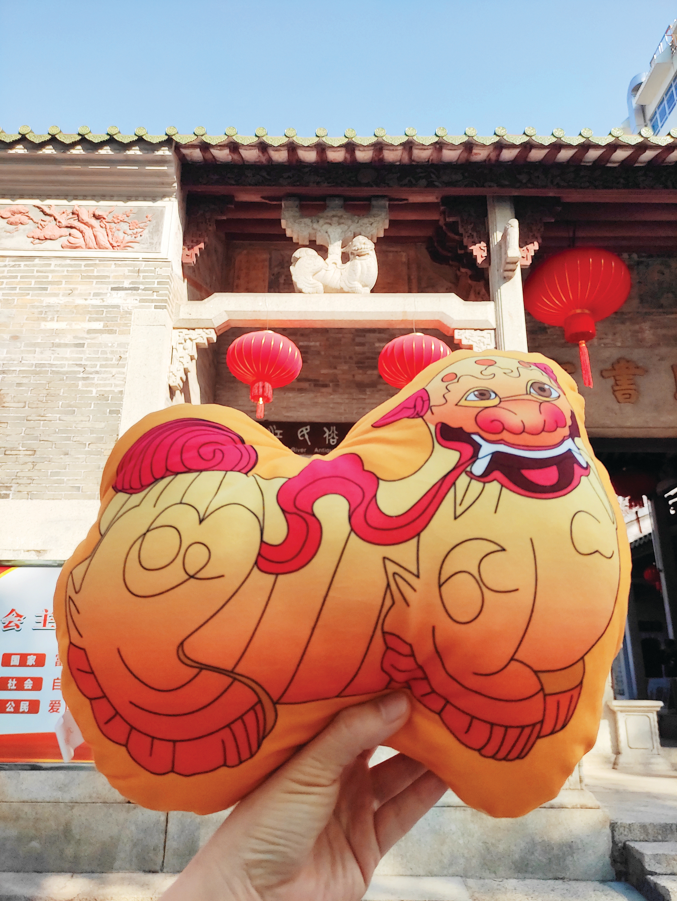 “丑萌丑萌”的貔貅瑞獸抱枕,讓人忍不住多拿捏幾把。這抱枕的原型為黃氏書(shū)室大門(mén)兩側(cè)建筑上的構(gòu)件石墩——辟邪獸貔貅。貔貅為獅形、有角、有翼,是中國(guó)古代神話(huà)里的一種神獸,象征著“仁”與“瑞”,古人相信它能招財(cái)聚寶、帶來(lái)好運(yùn)。這一款抱枕,將貔貅這一瑞獸形象卡通化,使其顯得奇趣可愛(ài)。