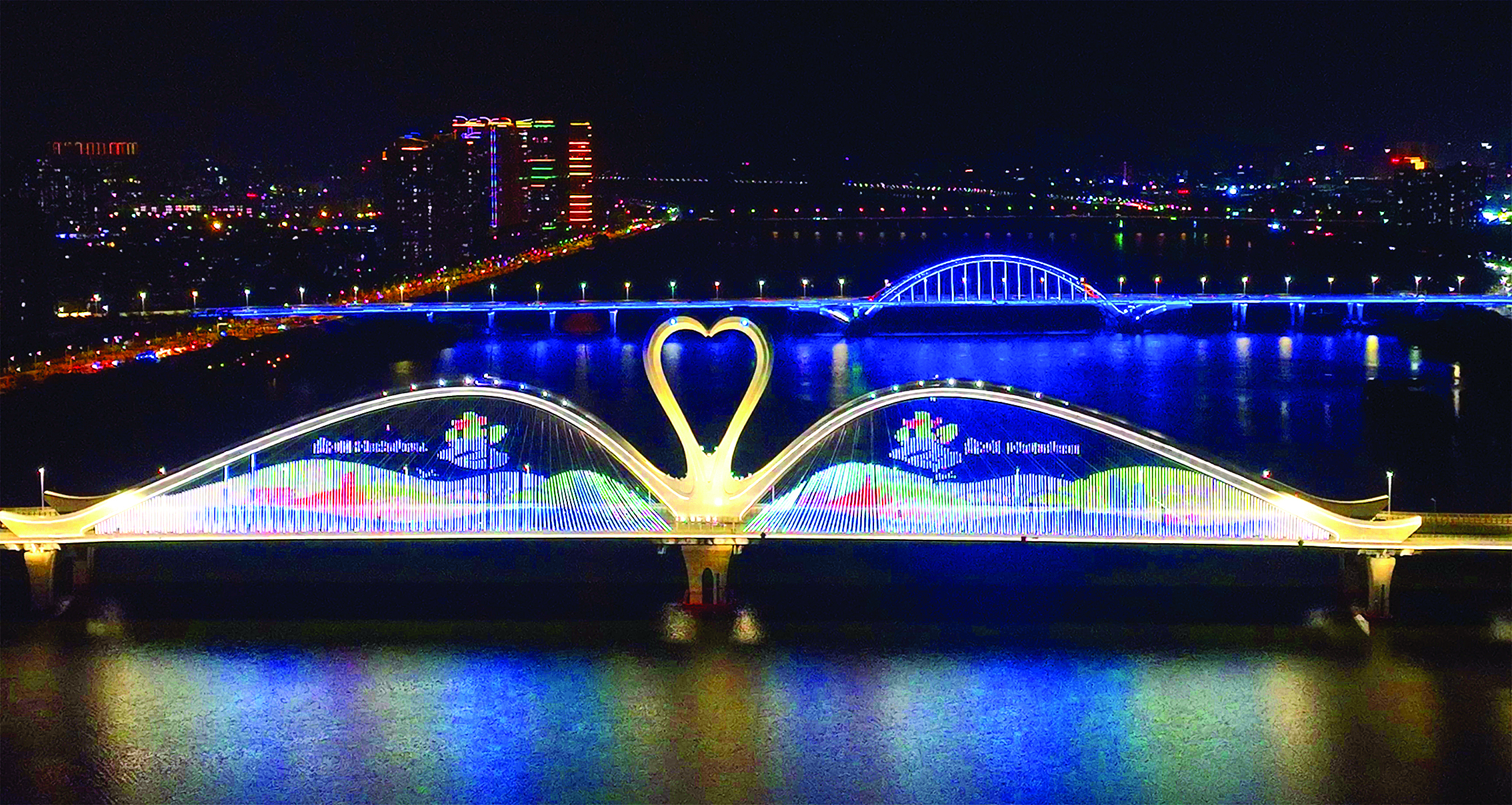 3月26日晚,鵝城大橋等城市地標亮燈,以燈光秀展示惠州城市品牌形象標識等內(nèi)容;葜萑請笥浾哏姇承 攝