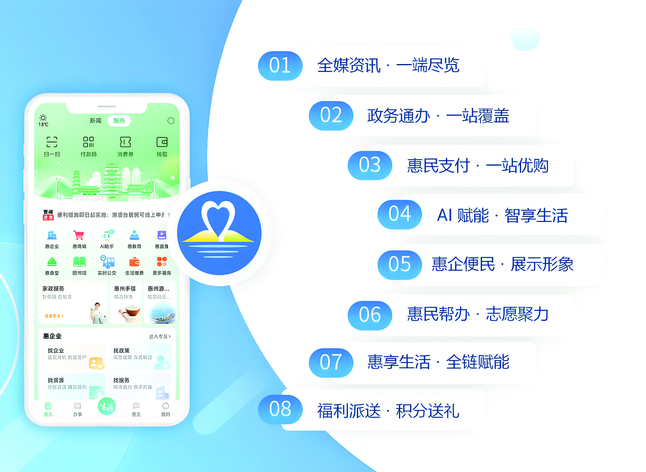 “惠民通”平臺(tái)以“1+2+N”模式打造,即一個(gè)智慧城市總?cè)肟凇⑿侣勑麄髋c便民利企兩大新平臺(tái)、N個(gè)應(yīng)用場(chǎng)景,成為惠州人“一站式”解鎖智慧生活的數(shù)字新引擎。其八大核心功能亮點(diǎn)如下: