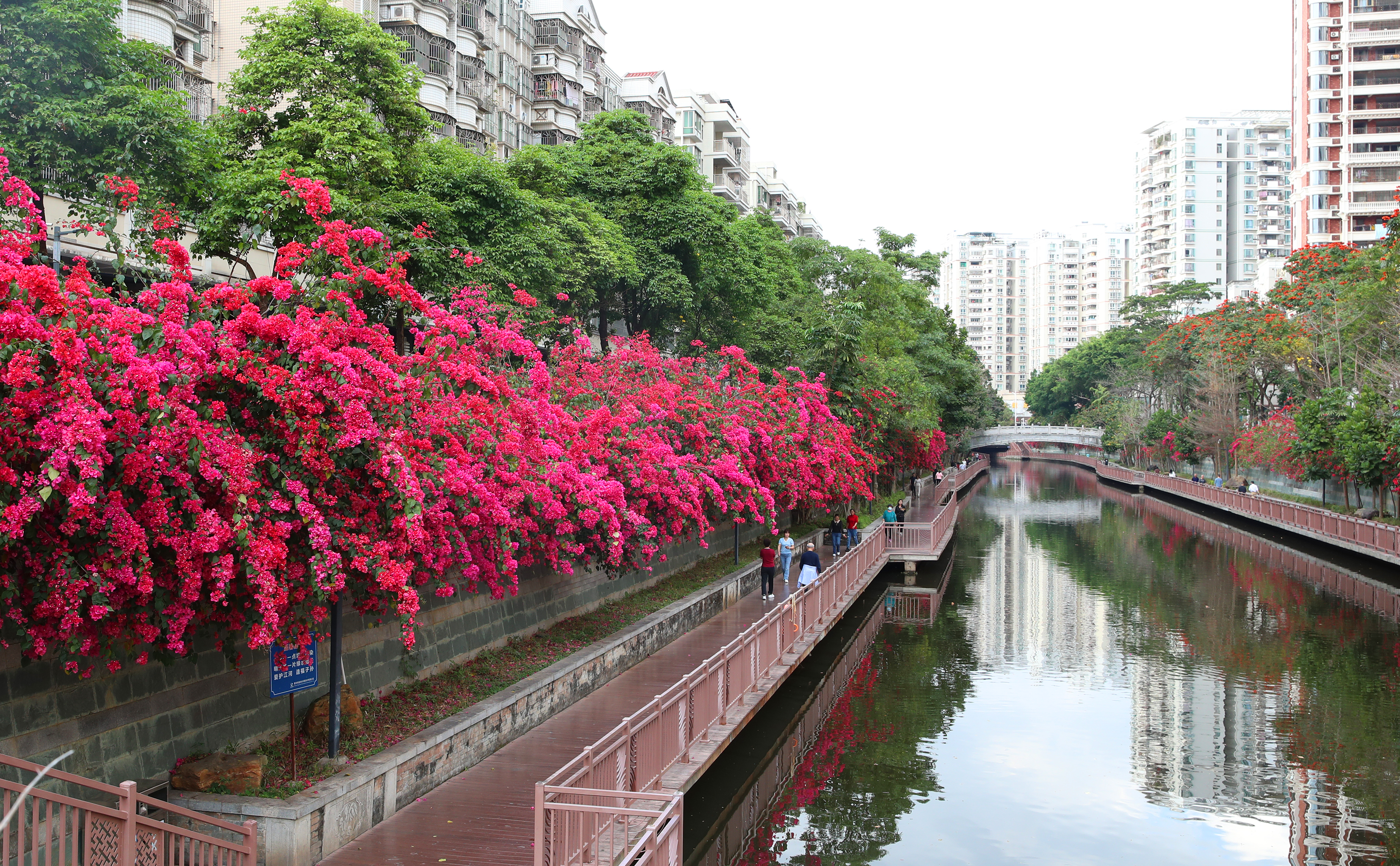 春天,草長鶯飛,百花盛開;葜菔袇^(qū)金山河沿岸的三角梅近日競相開放,春意盎然,嬌艷的花朵仿佛給金山河兩岸“戴”上了一條美麗的花帶,一路繁花錯(cuò)落有致,美得令人心醉,成為了市區(qū)一道亮麗的景觀。連日來,金山河畔吸引了大量市民和游客前來打卡。