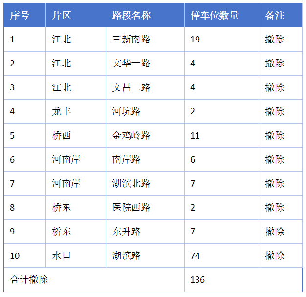 市區(qū)三新南路等路段路內(nèi)停車位調(diào)整明細表