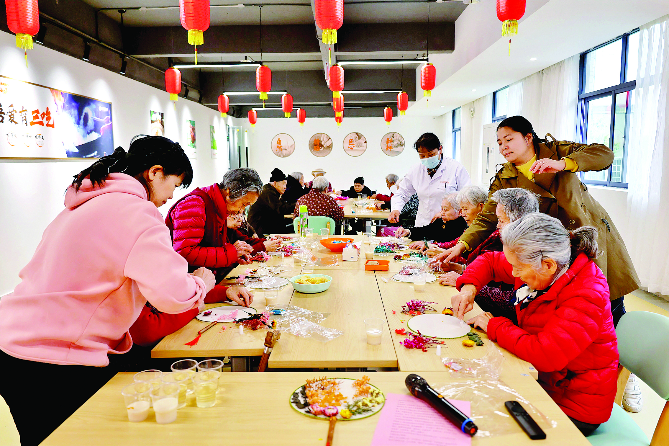 位于惠東平山街道泰園社區(qū)的惠東縣社會(huì)養(yǎng)老服務(wù)中心(綠康西枝家園)內(nèi),長者們?cè)谥谱鞲苫▓F(tuán)扇。圖片由泰園社區(qū)提供
