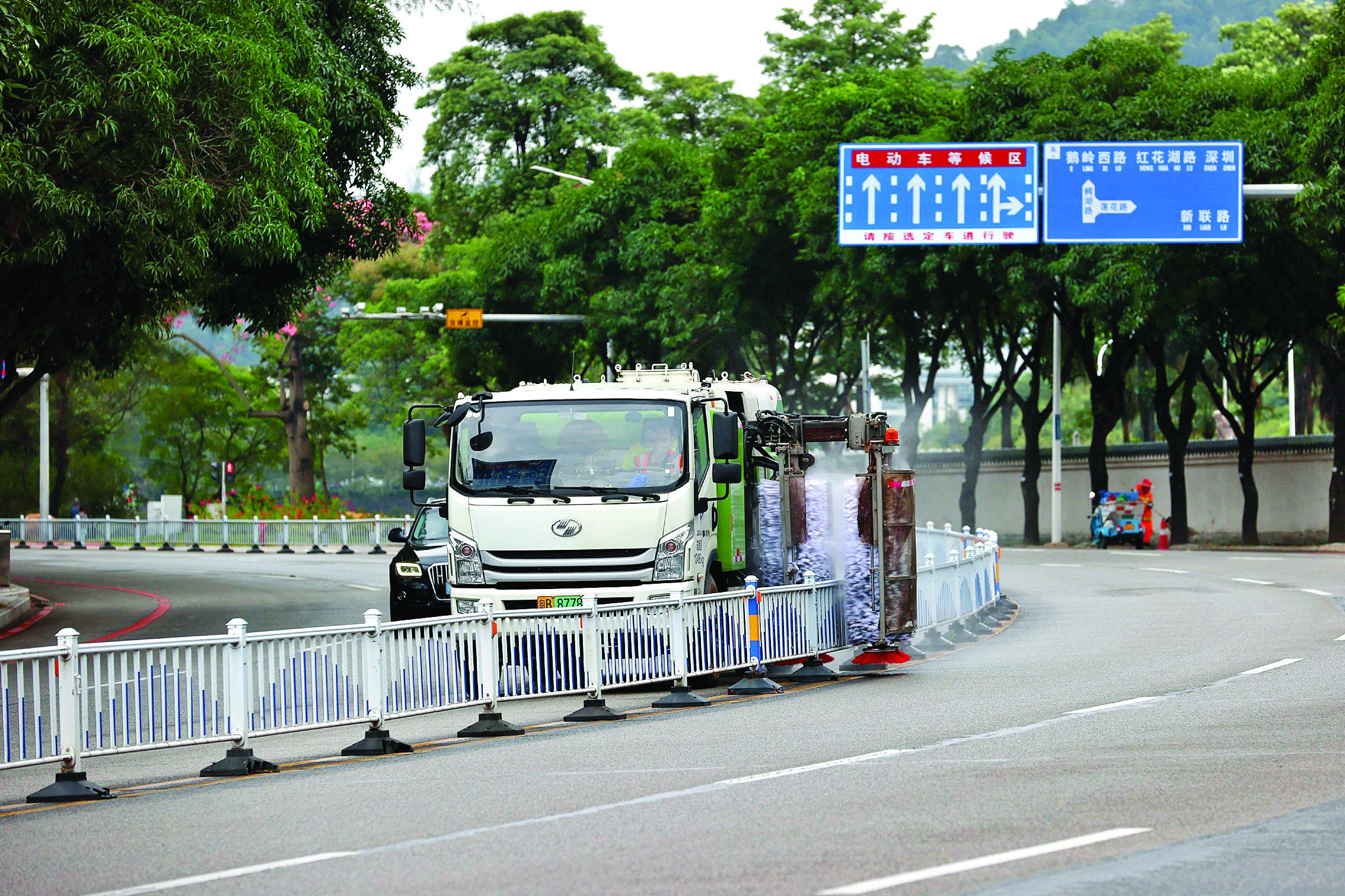 清潔車在清洗護(hù)欄;葜萑?qǐng)?bào)記者楊建業(yè) 攝