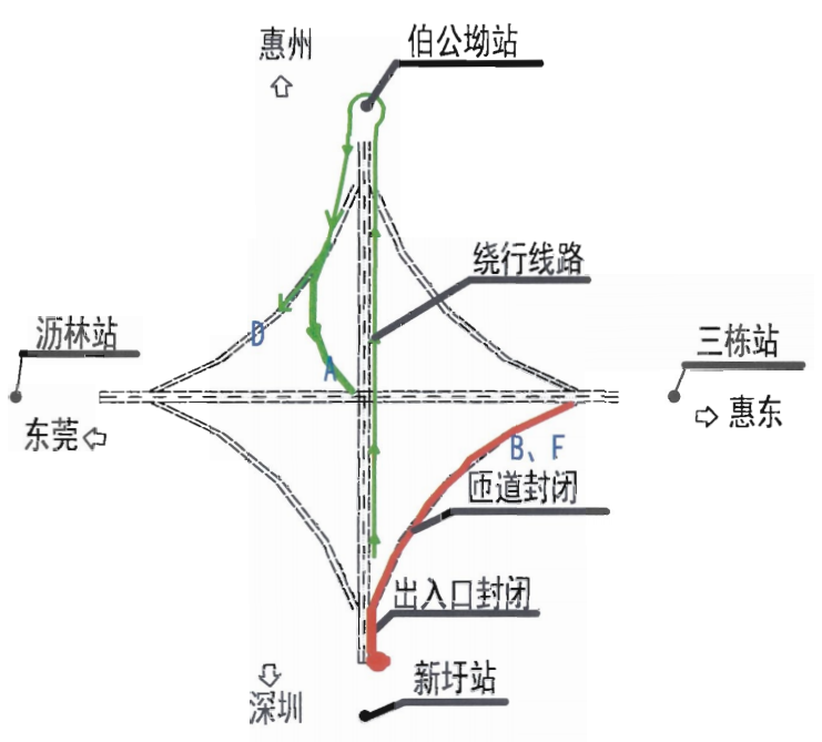 4月22日6:00至12:00,G25惠鹽高速往惠州方向鎮(zhèn)隆互通轉(zhuǎn)G1523潮莞高速惠州段出口匝道實(shí)施交通管制,禁止車輛通行。建議車輛由G25惠鹽高速往惠州方向主線行駛至伯公坳站繞行,掉頭后行駛G25惠鹽高速公路主線往深圳方向分別經(jīng)鎮(zhèn)隆互通D、A匝道前往G1523潮莞高速惠州段東莞和潮州方向。