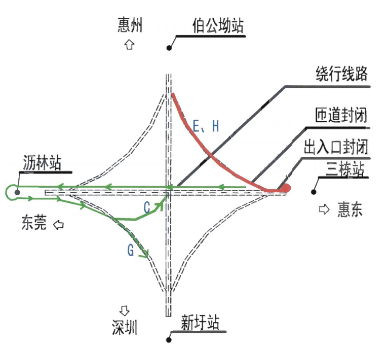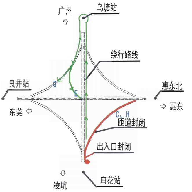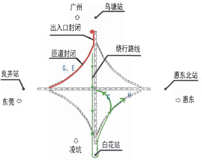 4月23日6:00至12:00,G1523潮莞高速惠州段往東莞方向鎮(zhèn)隆互通轉(zhuǎn)G25惠鹽高速出口匝道實(shí)施交通管制,禁止車輛通行,建議車輛由G1523潮莞高速惠州段往東莞方向主線行駛至瀝林站繞行,掉頭后行駛G1523潮莞高速惠州段主線往潮州方向分別經(jīng)鎮(zhèn)隆互通G、C匝道前往G25惠鹽高速深圳和惠州方向。