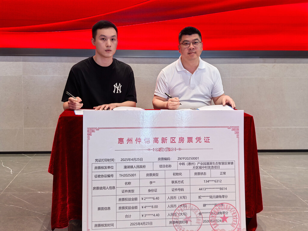 惠州日?qǐng)?bào)訊 4月25日下午,惠州市首張房票在仲愷高新區(qū)正式發(fā)放。來(lái)自潼湖鎮(zhèn)的李先生接過(guò)紅色票證后,隨即在星河冠譽(yù)府銷(xiāo)售中心簽訂了房屋認(rèn)購(gòu)書(shū),成為新政首位受益者。目前,仲愷高新區(qū)推行城中村改造項(xiàng)目房票安置實(shí)施方案,自核發(fā)之日起12個(gè)月內(nèi),使用人可憑房票在仲愷高新區(qū)范圍內(nèi)自主選擇房源。