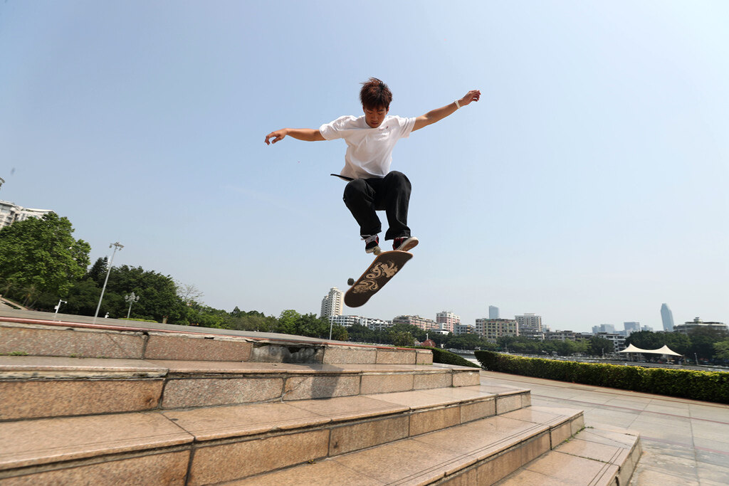 丘雅豪很享受滑板運(yùn)動里靈魂自由舒展的快樂;葜萑請(bào)記者楊建業(yè) 攝