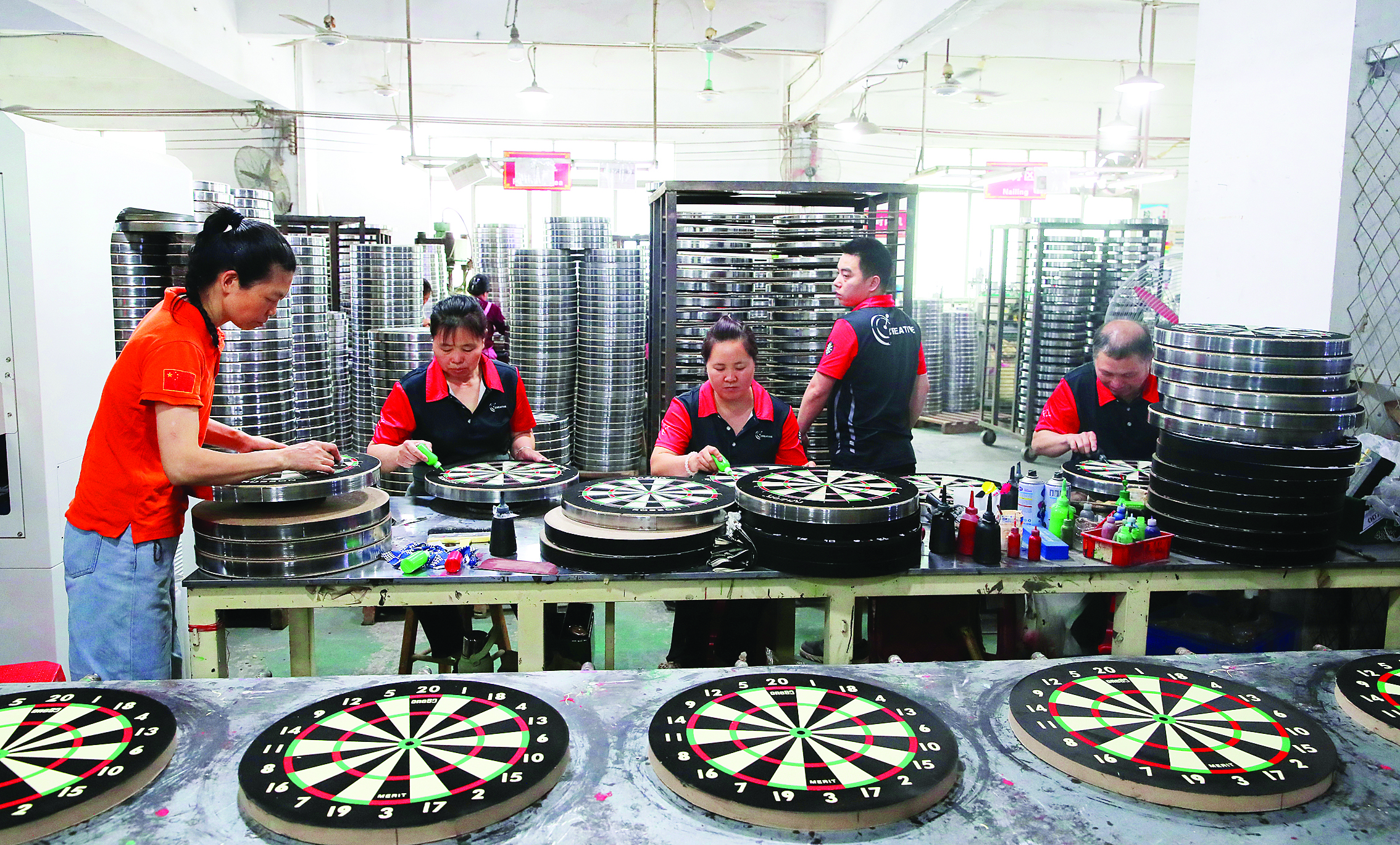 值得一提的是,創(chuàng)展公司的不少生產(chǎn)設(shè)備都是自主研發(fā)的,從而提高效率、降低成本。“現(xiàn)在每個(gè)月生產(chǎn)飛鏢靶6萬至7萬片,產(chǎn)能和市場占有率全球領(lǐng)先。”張治國告訴記者,自動(dòng)化水平不斷提高,生產(chǎn)所需要的人力成本降低,成為公司在競爭中脫穎而出的方法之一!拔覀兪冀K堅(jiān)持以人為本的辦廠理念,有著一批具有豐富經(jīng)驗(yàn)和專業(yè)知識(shí)的人才隊(duì)伍,不斷對(duì)產(chǎn)品、工藝進(jìn)行改善,研發(fā)各種適合各地市場的新產(chǎn)品,滿足不同客戶的需求。”