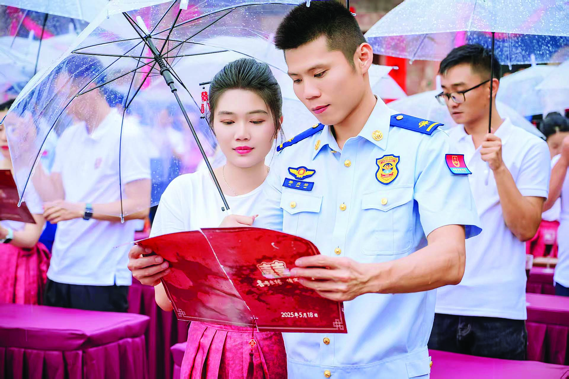 70對(duì)新人來(lái)自社會(huì)各界,既有堅(jiān)守一線的消防戰(zhàn)士和醫(yī)護(hù)人員,也有扎根鄉(xiāng)土的創(chuàng)業(yè)青年。來(lái)自惠州市消防救援支隊(duì)龍城消防救援站的聶廣文攜著新娘田蜜的手幸福地說(shuō):“平時(shí)我的工作比較忙,今天我們來(lái)參加集體婚禮,和其他新人共同見(jiàn)證人生中的重要時(shí)刻,特別有意義!薄霸谖覀兛图胰丝磥(lái),結(jié)婚時(shí)下雨非常吉利,我的先生是一名消防員,我是一名護(hù)士,在以后的婚姻生活中,我會(huì)守護(hù)好小家,也會(huì)支持我的先生,守護(hù)好大家。”新娘田蜜說(shuō)。