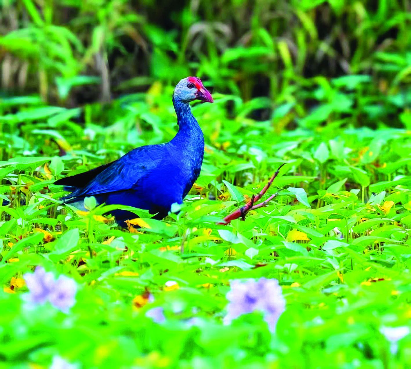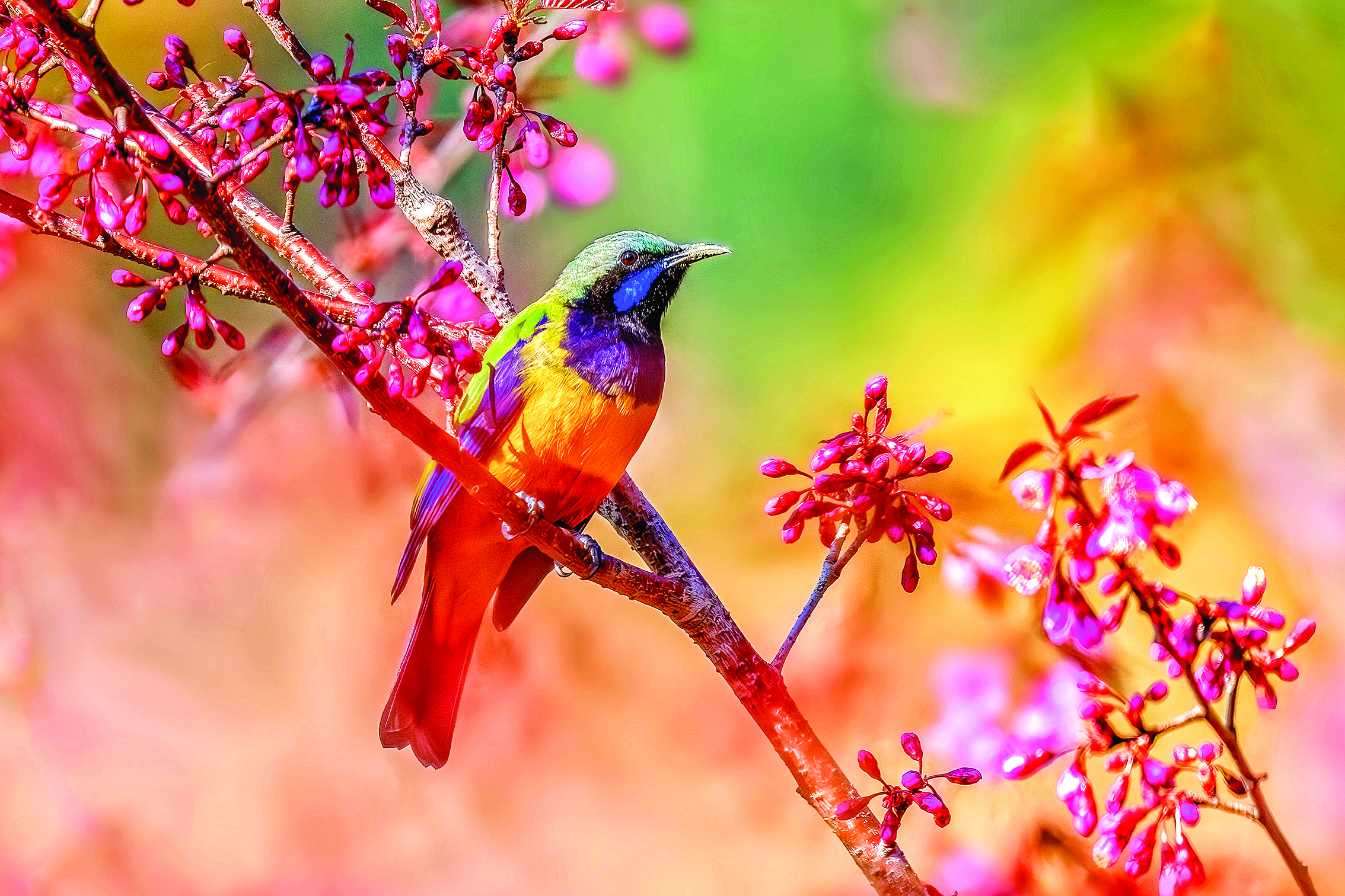 5月的惠州植物園,澄澈的湖面波光瀲滟,白鵝悠然游弋,岸邊樹木枝繁葉茂,橙紅與翠綠交織搖曳。一只朱背啄花鳥停歇枝頭,它頭頂艷紅似火,背部藍(lán)黑羽毛泛著幽幽光澤,腹部羽毛淺淡柔和,靈動(dòng)的眼睛與小巧的喙透著與生俱來的機(jī)敏!傍B友”們紛紛舉起相機(jī),定格下這珍貴的瞬間。