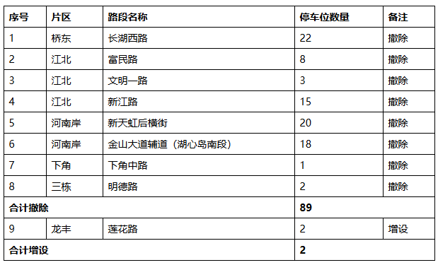 市區(qū)長湖西路等路段路內(nèi)停車位調(diào)整明細(xì)表