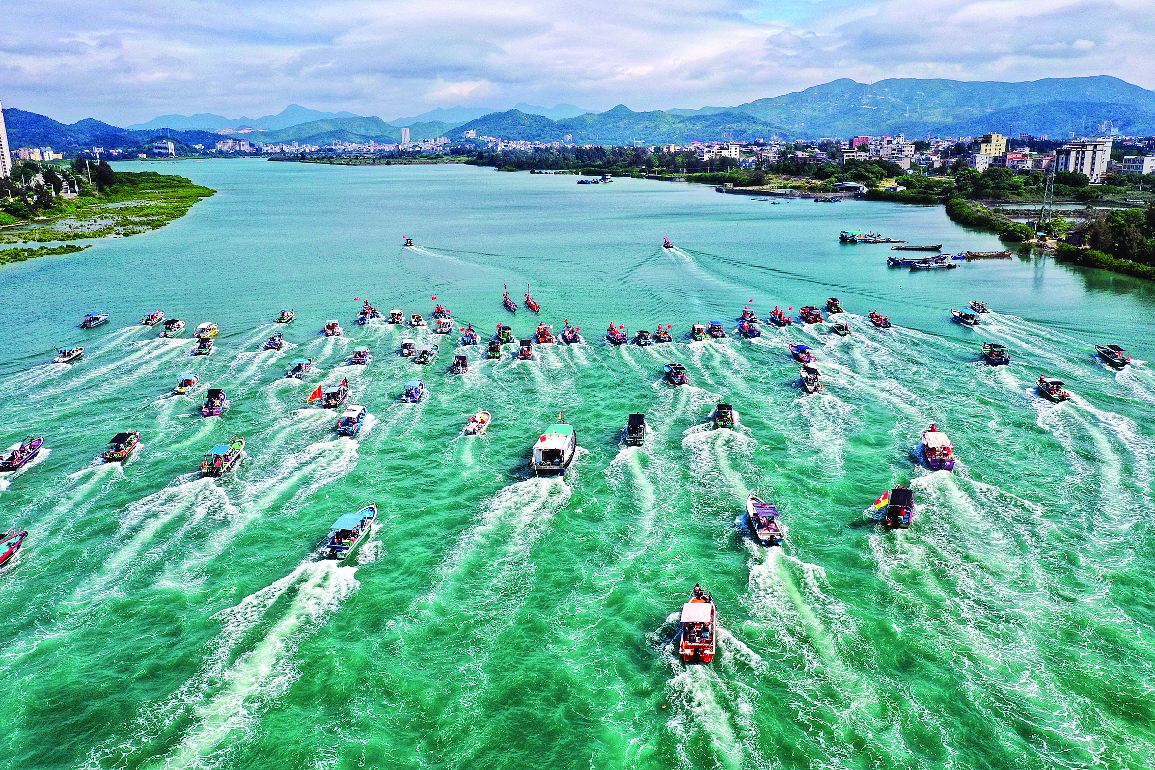 5月31日正是端午佳節(jié),惠東縣港口濱海旅游度假區(qū)內(nèi)灣,新村村龍舟賽熱鬧非凡。海面上,兩艘龍舟領(lǐng)銜,群舟如靈動(dòng)游魚(yú)競(jìng)發(fā)。五彩船只或齊心劃槳,或疾馳破浪,年輕的村民們動(dòng)作整齊,盡顯團(tuán)隊(duì)激情與競(jìng)渡的蓬勃生機(jī)。 惠州日?qǐng)?bào)記者朱金贊 攝