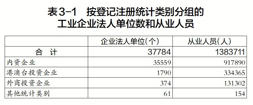 在工業(yè)企業(yè)法人單位中,內(nèi)資企業(yè)35559個(gè),占94.1%;港澳臺(tái)投資企業(yè)1790個(gè),占4.7%;外商投資企業(yè)374個(gè),占1.0%。