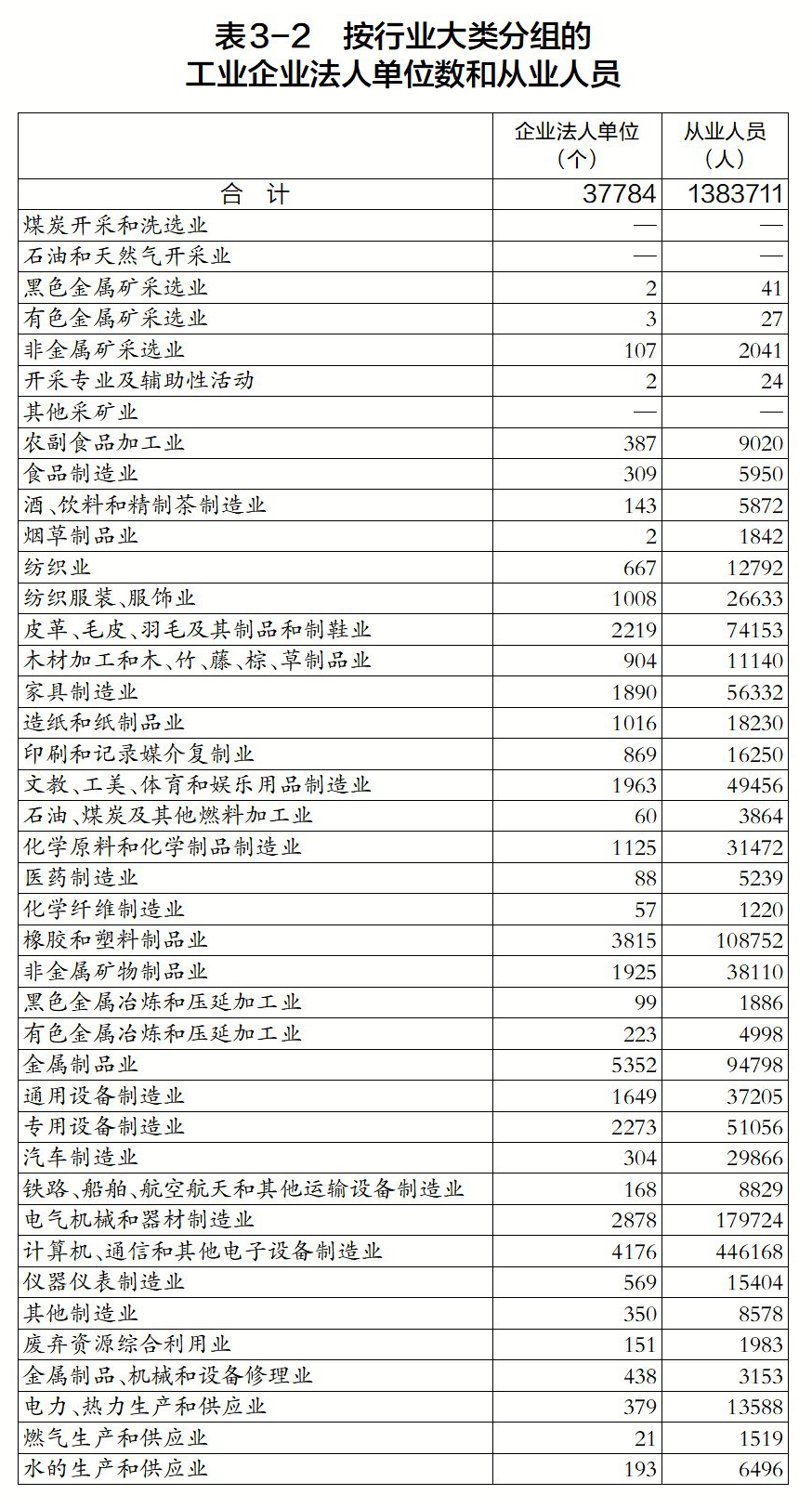 在工業(yè)企業(yè)法人單位從業(yè)人員中,采礦業(yè)2133人,制造業(yè)1359975人,電力、熱力、燃?xì)饧八a(chǎn)和供應(yīng)業(yè)21603人,分別占0.2%、98.3%和1.6%。在工業(yè)行業(yè)大類(lèi)中,計(jì)算機(jī)通信和其他電子設(shè)備制造業(yè)、電氣機(jī)械和器材制造業(yè)、橡膠和塑料制品業(yè)從業(yè)人員數(shù)位居前三位,分別占32.2%、13.0%和7.9%(詳見(jiàn)表3-2)。