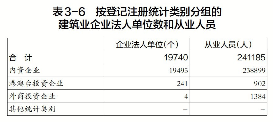 建筑業(yè)企業(yè)法人單位中,內(nèi)資企業(yè)19495個(gè),占98.8%;港澳臺(tái)投資企業(yè)241個(gè),占1.2%;外商投資企業(yè)4個(gè),占0.02%。