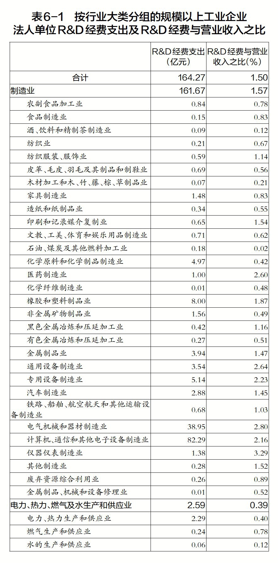 2023年,規(guī)模以上工業(yè)企業(yè)法人單位R&D經(jīng)費(fèi)支出164.27億元,比2018年增長(zhǎng)83.9%;R&D經(jīng)費(fèi)與營(yíng)業(yè)收入之比為1.5%。規(guī)模以上工業(yè)企業(yè)法人單位分行業(yè)R&D經(jīng)費(fèi)支出及R&D經(jīng)費(fèi)與營(yíng)業(yè)收入之比詳見表6-1。
