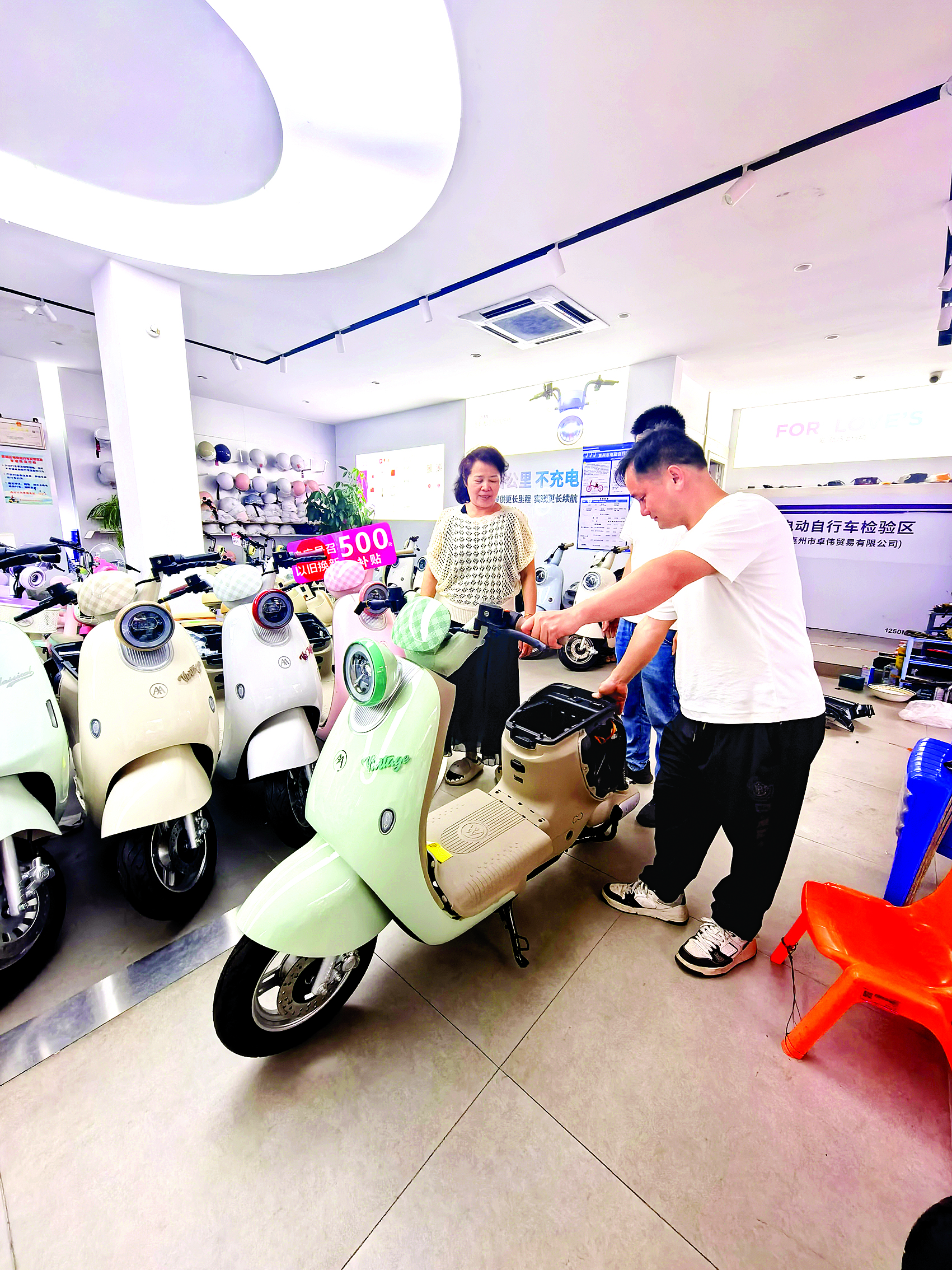 “端午假期這幾天,店里生意非常好,前來看車的客戶有近50批。因為廠家也有促銷,帶動了銷售,最終累計成交16輛,比去年同期增長了一倍!6月3日下午,在市區(qū)江北一家雅迪電動車銷售門店,店主王先生正在給購車的幾位顧客登記上牌信息。他告訴記者,受國補(bǔ)利好的推動,今年1~5月,店里的銷售量同比增長近40%,其中,以舊換新的客戶超過3成。