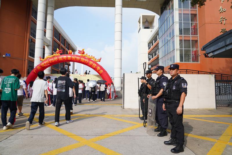 高考首日,惠州公安出動警力3300人次在全市33個(gè)考點(diǎn)開展安保工作,護(hù)航高考。