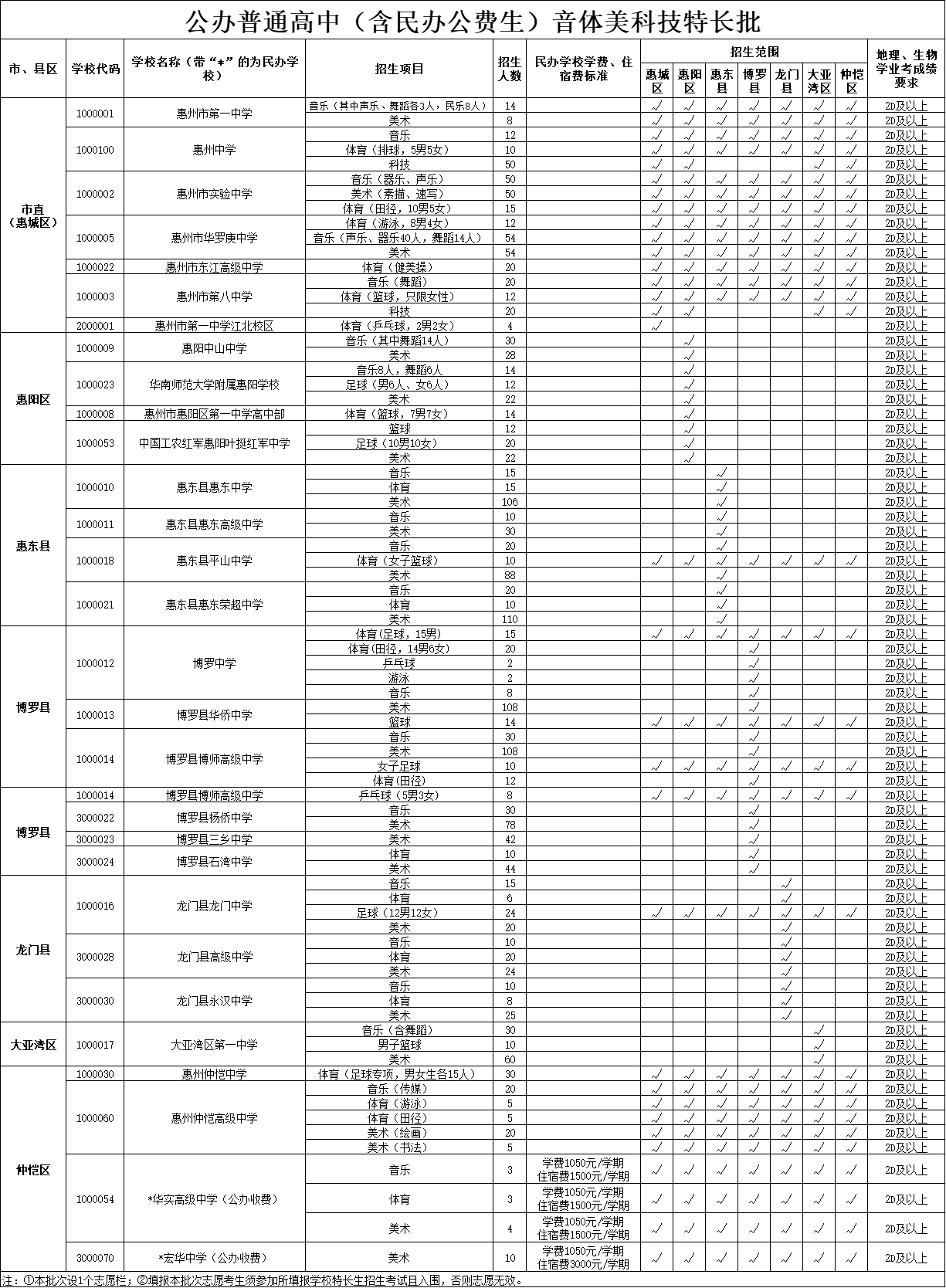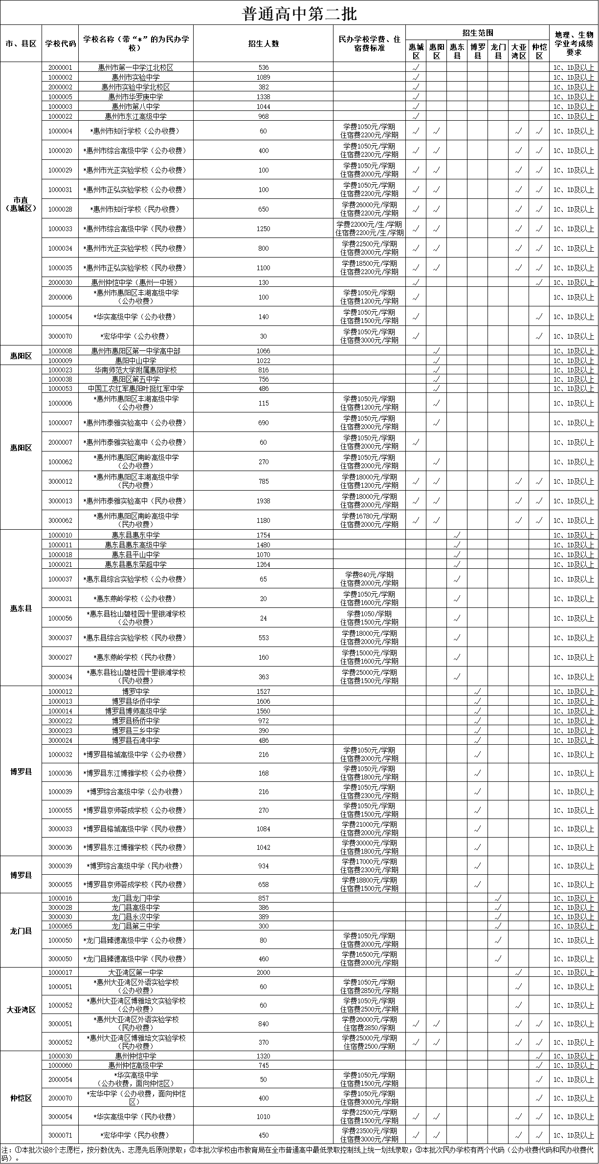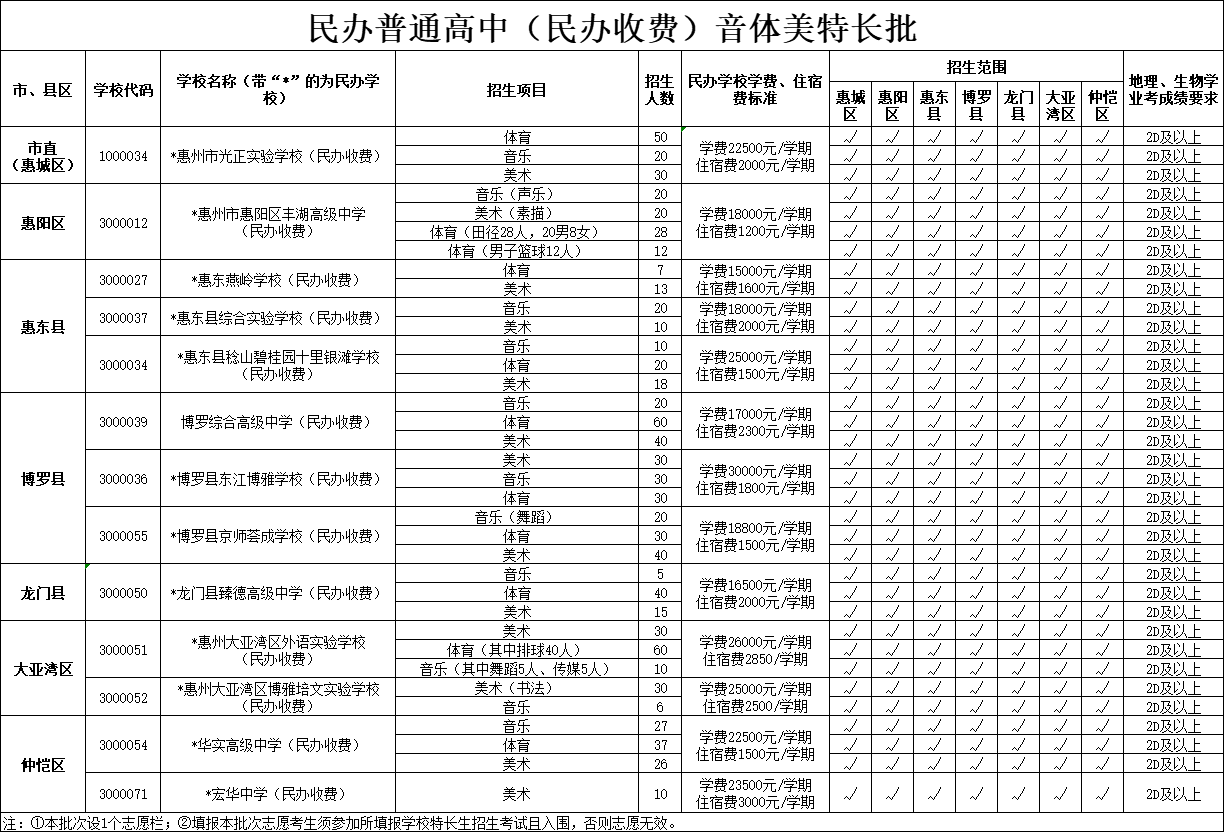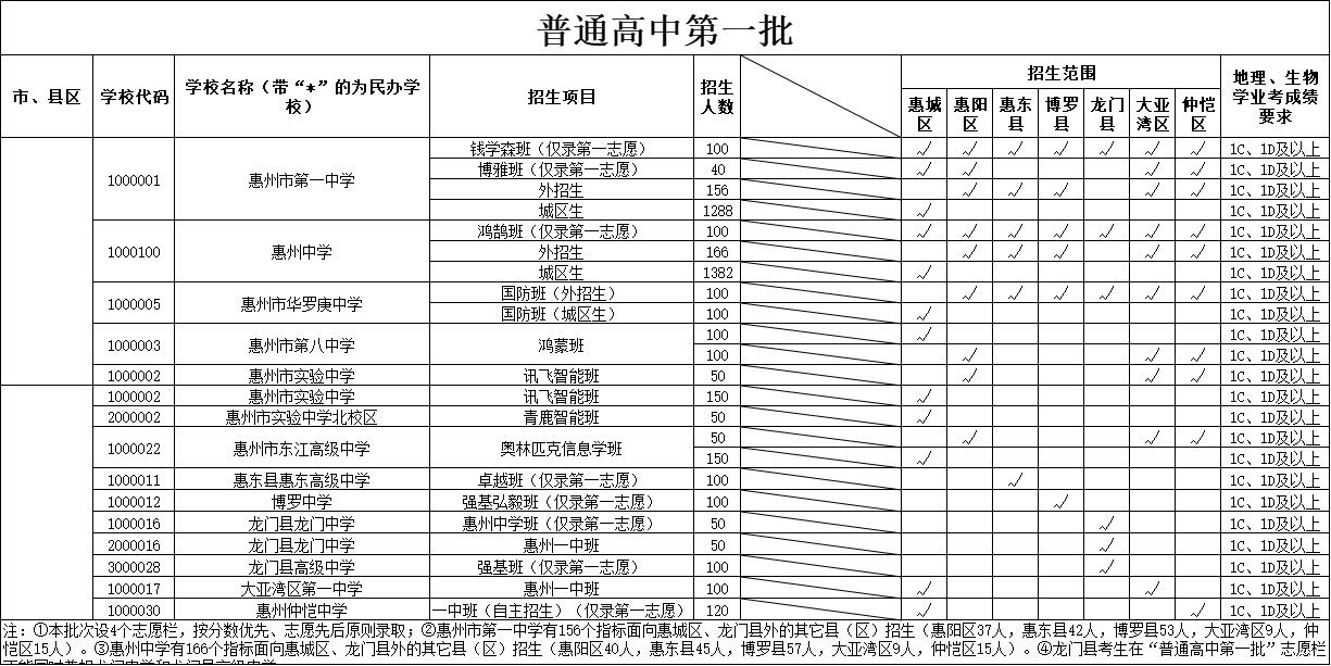 根據(jù)有關(guān)文件要求,今年惠州市將繼續(xù)貫徹落實(shí)國家和省有關(guān)屬地招生和公民同招等政策要求,在第二批招生的惠州市知行學(xué)校、惠州市綜合高級(jí)中學(xué)、惠州市光正實(shí)驗(yàn)學(xué)校、惠州市正弘實(shí)驗(yàn)學(xué)校等市直民辦普通高中學(xué)校主要面向四個(gè)區(qū)(惠城區(qū)、惠陽區(qū)、大亞灣區(qū)、仲愷區(qū))招生,各縣民辦普通高中學(xué)校主要面向本縣域招生。沒有完成招生計(jì)劃的民辦普通高中學(xué)校,在補(bǔ)錄志愿時(shí),可面向全市進(jìn)行補(bǔ)錄。