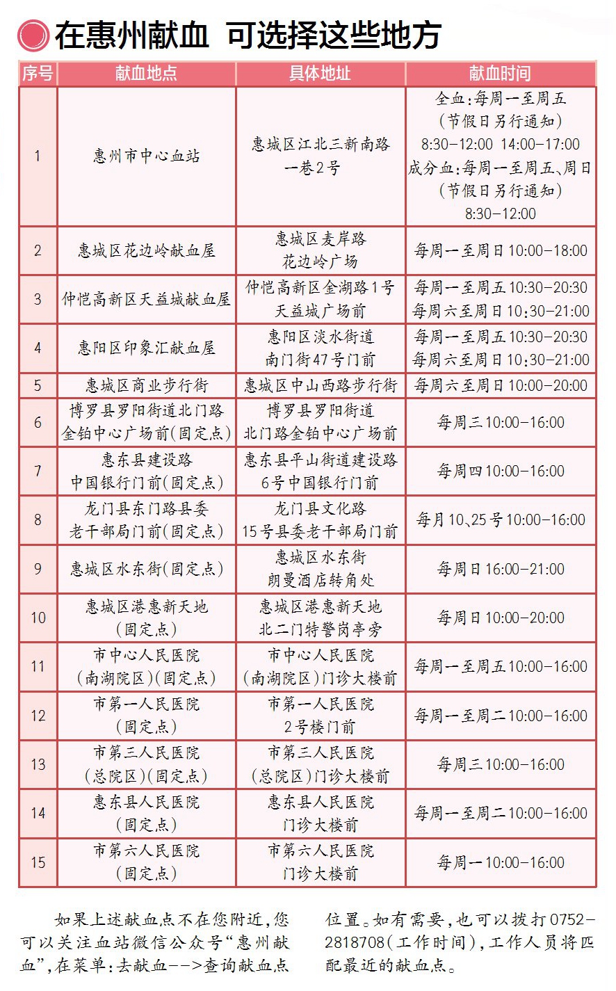“人體的血液是可以再生的,捐獻可以再生的血液,就能挽救更多不可重來的生命!被葜菔兄行难竟ぷ魅藛T說,獻血是一項利己利人的善舉。目前熱心市民除了可以直接到惠州市中心血站獻血服務大廳參與無償獻血外,還能選擇到由惠州市中心血站布局在全市不同地點的愛心獻血屋、流動采血車等獻血點獻血。