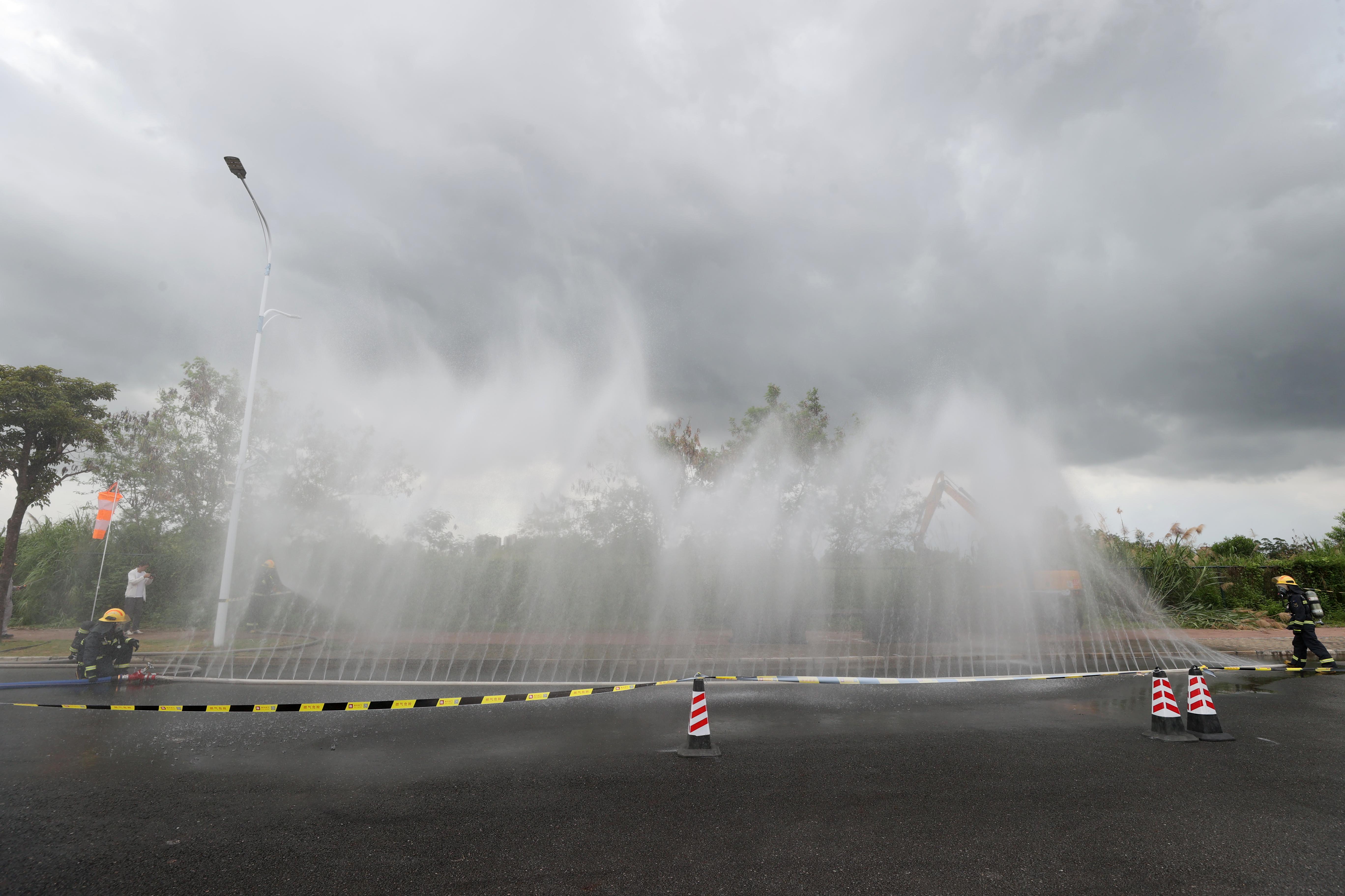 消防員到場(chǎng),用水霧驅(qū)散燃?xì)獗Wo(hù)現(xiàn)場(chǎng)作業(yè);葜萑?qǐng)?bào)記者楊建業(yè) 攝