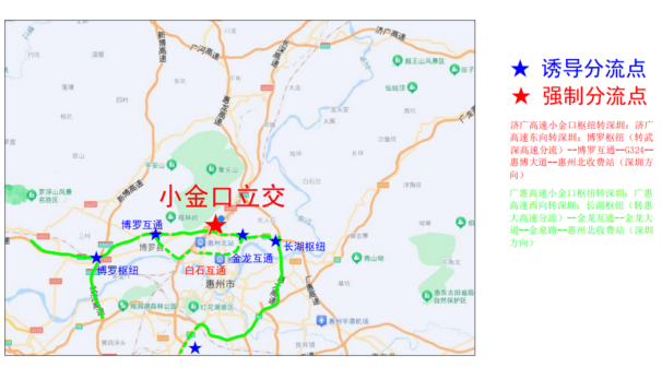 廣惠高速小金口立交轉(zhuǎn)長(zhǎng)深高速深圳方向匝道交通管制時(shí)間為7月3日10:00-8月31日10:00,廣惠高速小金口立交轉(zhuǎn)長(zhǎng)深高速深圳方向匝道臨時(shí)封閉,禁止車輛通行。廣惠高速小金口立交轉(zhuǎn)長(zhǎng)深高速深圳方向的車輛,請(qǐng)?zhí)崆霸趶V惠高速小金口收費(fèi)站下高速繞行長(zhǎng)深高速四角樓或惠州北收費(fèi)站通行;若行駛過(guò)小金口收費(fèi)站的車輛可到四角樓收費(fèi)站下高速再上高速往深圳方向通行。