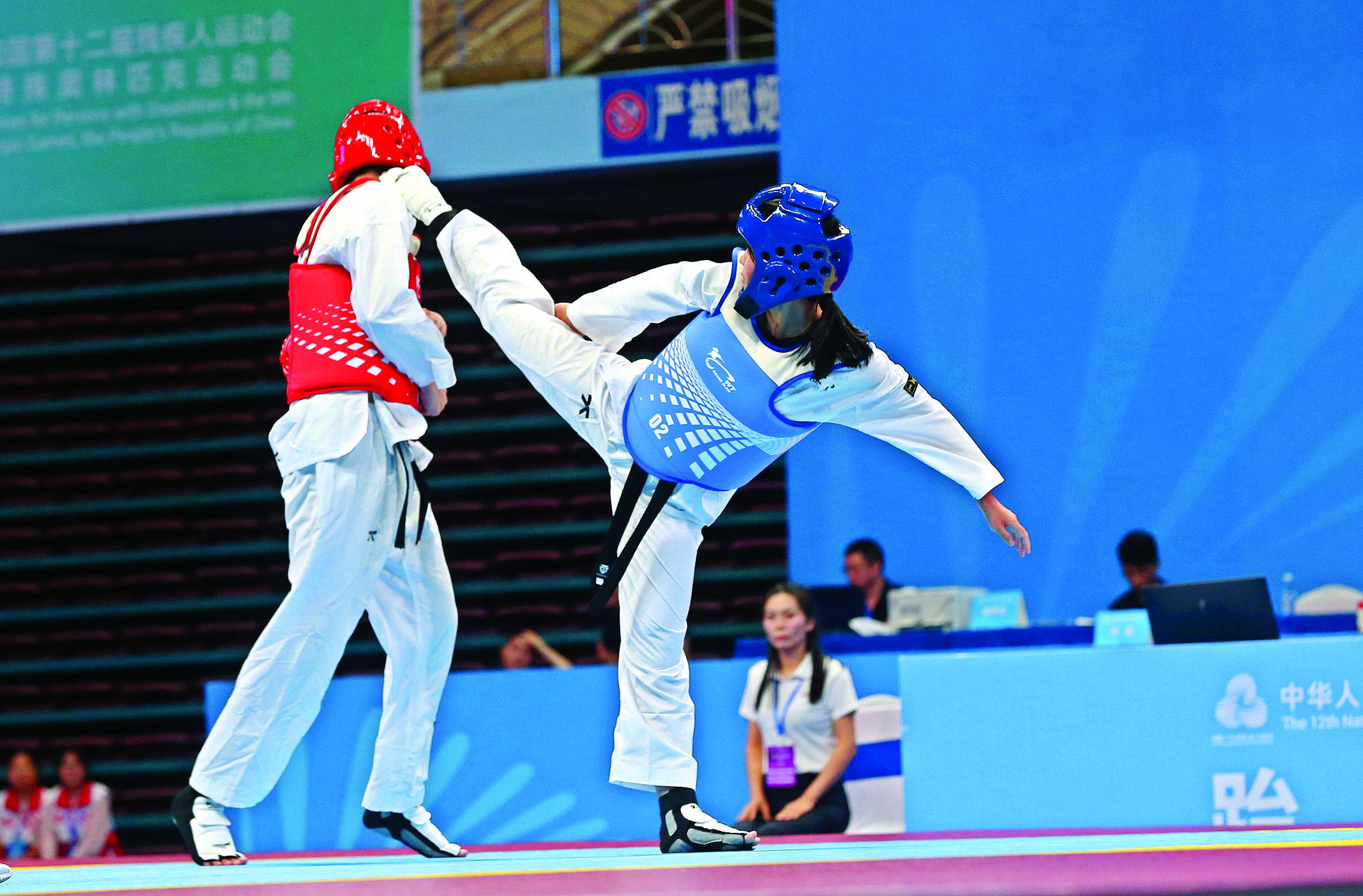 賽場上,運(yùn)動員們斗志昂揚(yáng)、神采奕奕,以精湛嫻熟的技術(shù)動作與堅韌不拔的拼搏精神,為現(xiàn)場觀眾奉獻(xiàn)了一場場緊張精彩的對決!绑w育競技沒有捷徑,只能不斷練習(xí)。”來自廣東代表隊的黎遠(yuǎn)瑩在K44混合團(tuán)體項目中獲得第二名。今年30歲的黎遠(yuǎn)瑩來自清遠(yuǎn),5歲時因意外受傷造成肢體殘疾,曾參加第六屆省殘運(yùn)會,此后連續(xù)三屆參賽,并在2018年第八屆省殘運(yùn)會田徑項目中斬獲銀牌。今年,黎遠(yuǎn)瑩轉(zhuǎn)戰(zhàn)跆拳道賽場,盡管練習(xí)跆拳道不到半年,憑借扎實的體育基礎(chǔ),今年6月,她在2025年全國殘疾人跆拳道錦標(biāo)賽中獲得了第三名的好成績。此次參加K44混合團(tuán)體賽,她又收獲一枚銀牌。“我接觸到的殘疾運(yùn)動員,不管是身體康復(fù)、心理健康,還是社交能力,都因為運(yùn)動而發(fā)生了很大改變。”黎遠(yuǎn)瑩感慨道,運(yùn)動徹底改變了她的人生。