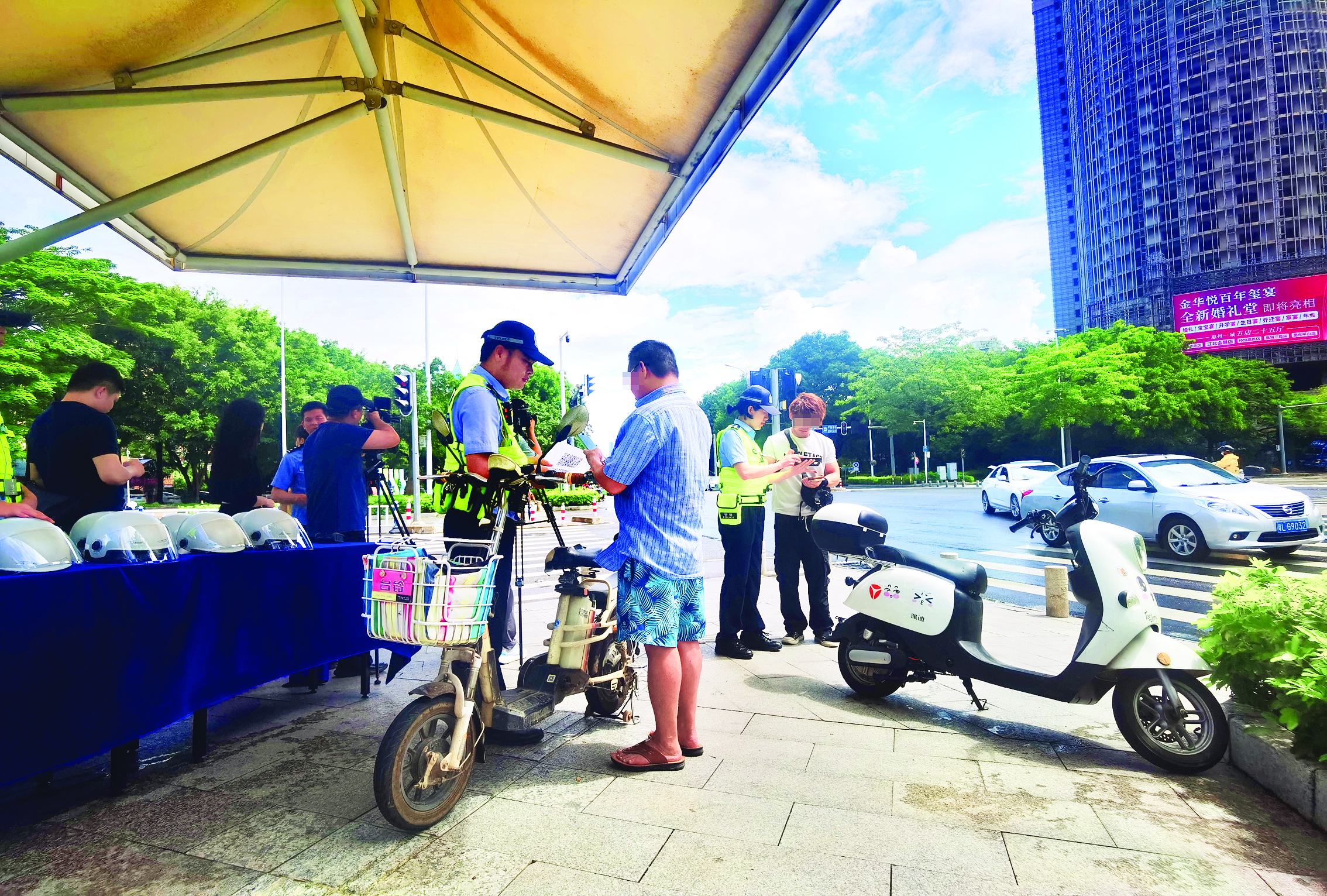 惠州交警對駕乘電動自行車未規(guī)范佩戴安全頭盔、未按道行駛等交通違法行為進(jìn)行處罰。惠州日報記者劉豪偉 攝