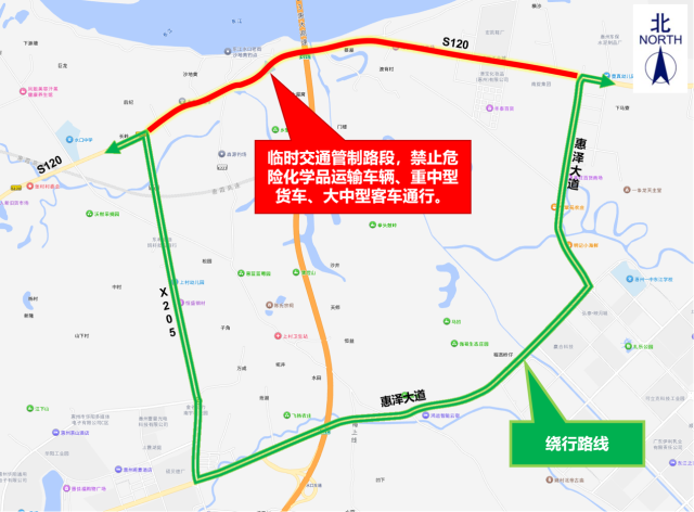 交通管制期間,原通過省道S120(縣道X205至惠澤大道路段)通行的車輛,請通過縣道X205-惠澤大道繞行。確需途經(jīng)施工路段的其他車輛(危險化學(xué)品運輸車輛、重中型貨車、大中型客車除外),請根據(jù)現(xiàn)場交通標(biāo)志標(biāo)線指引以及現(xiàn)場交通管理人員指揮通行。