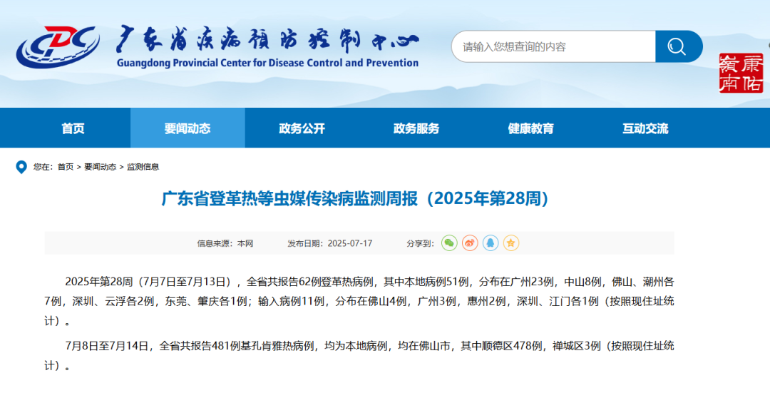 據(jù)廣東省疾病預防控制中心網(wǎng)站發(fā)布廣東省登革熱等蟲媒傳染病監(jiān)測周報(2025年第28周)顯示,2025年第28周(7月7日至7月13日),全省共報告62例登革熱病例,其中本地病例51例,分布在廣州23例,中山8例,佛山、潮州各7例,深圳、云浮各2例,東莞、肇慶各1例;輸入病例11例,分布在佛山4例,廣州3例,惠州2例,深圳、江門各1例(按照現(xiàn)住址統(tǒng)計)。