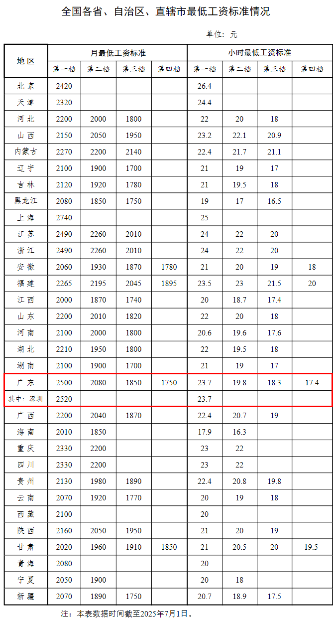 根據(jù)今年2月14日廣東省人民政府印發(fā)的《關(guān)于調(diào)整我省最低工資標(biāo)準(zhǔn)的通知》,月最低工資標(biāo)準(zhǔn)和非全日制小時(shí)最低工資標(biāo)準(zhǔn)從2025年3月1日起調(diào)整提高。其中廣州、深圳執(zhí)行一類標(biāo)準(zhǔn),廣州市調(diào)整為2500元/月,深圳市調(diào)整為2520元/月,兩市對(duì)應(yīng)的非全日制小時(shí)最低工資標(biāo)準(zhǔn)均為23.7元/小時(shí);二類標(biāo)準(zhǔn)調(diào)整為2080元/月,執(zhí)行地區(qū)為珠海、佛山、東莞、中山,對(duì)應(yīng)的非全日制小時(shí)最低工資標(biāo)準(zhǔn)為19.8元/小時(shí);三類標(biāo)準(zhǔn)調(diào)整為1850元/月,執(zhí)行地區(qū)為汕頭、惠州、江門、湛江、肇慶,對(duì)應(yīng)的非全日制小時(shí)最低工資標(biāo)準(zhǔn)為18.3元/小時(shí);四類標(biāo)準(zhǔn)調(diào)整為1750元/月,執(zhí)行地區(qū)為韶關(guān)、河源、梅州等10個(gè)市,對(duì)應(yīng)的非全日制小時(shí)最低工資標(biāo)準(zhǔn)為17.4元/小時(shí)。