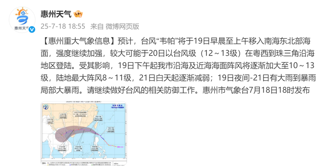 鑒于臺風“韋帕”發(fā)展趨勢,根據《惠州市防汛防旱防風防凍應急預案》,市三防指揮部決定于7月19日9時啟動防風Ⅳ級應急響應,并提醒各級各部門按照職責分工和預案規(guī)定,強化組織領導,層層壓實責任,加強預測預報預警,適時啟動本地區(qū)(部門)應急響應,積極做好防范應對工作,全力確保人民群眾生命財產安全。