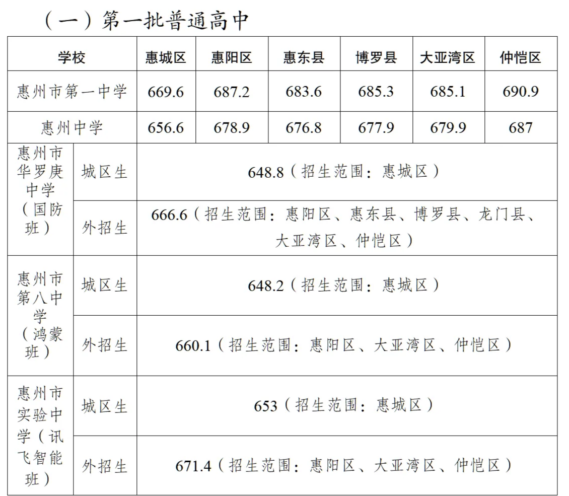 第一批普通高中里,惠州市第一中學(xué)錄取分?jǐn)?shù)線為:惠城區(qū)669.6分、惠陽區(qū)687.2分、惠東縣683.6分、博羅縣685.3分、大亞灣區(qū)685.1分、仲愷高新區(qū)690.9分;葜葜袑W(xué)錄取分?jǐn)?shù)線為:惠城區(qū)656.6分、惠陽區(qū)678.9分、惠東縣676.8分、博羅縣677.9分、大亞灣區(qū)679.9分、仲愷高新區(qū)687分;葜菔腥A羅庚中學(xué)城區(qū)生錄取分?jǐn)?shù)線為648.8分,惠州市華羅庚中學(xué)外招生錄取分?jǐn)?shù)線為666.6分。