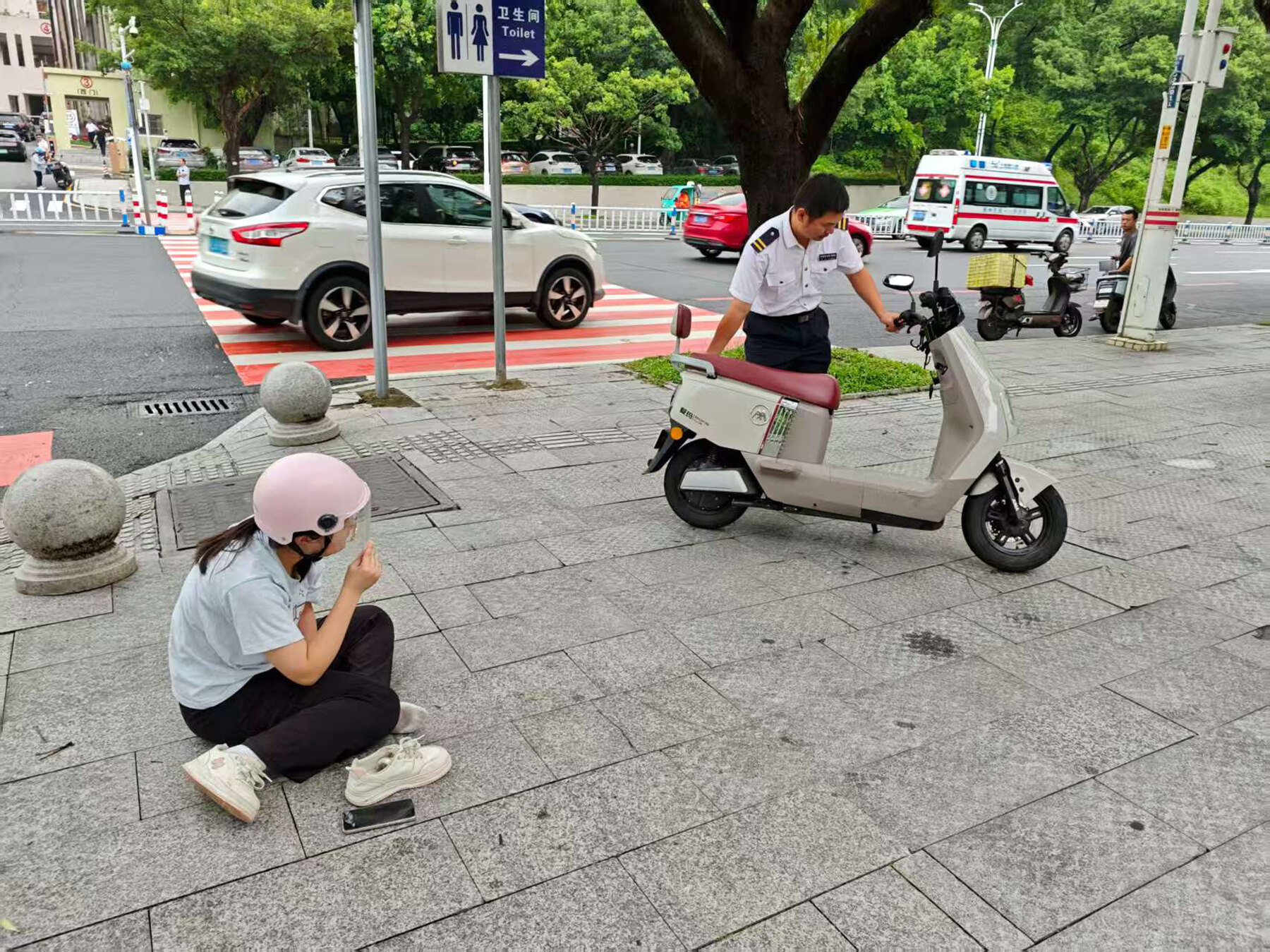 傷者被黃浩和熱心群眾扶起轉(zhuǎn)移至路邊安全區(qū)域。江北街道提供