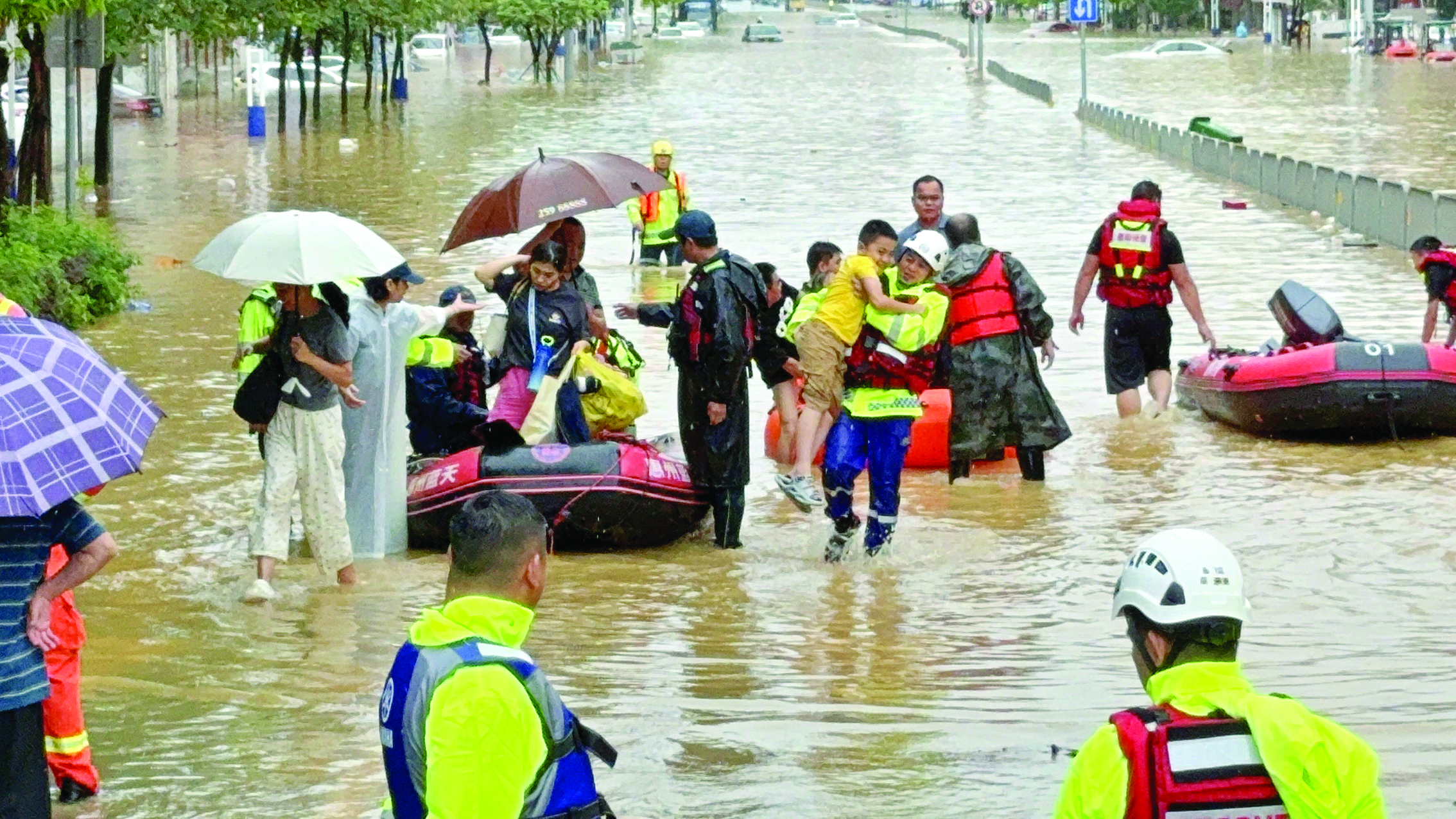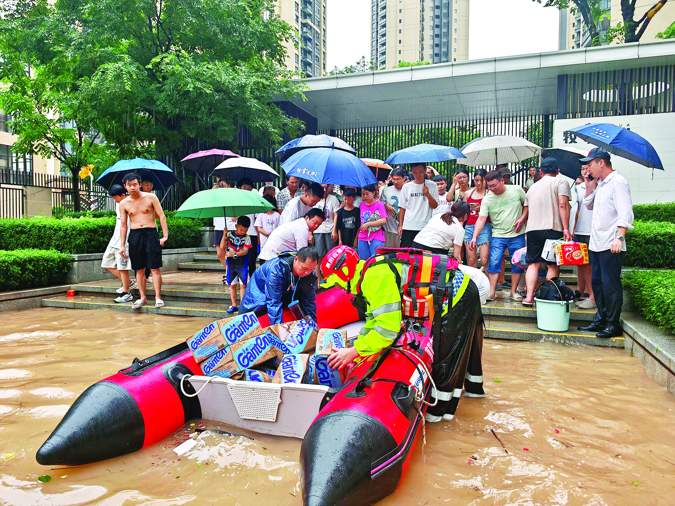 5日上午,仲愷高新區(qū)陳江街道銀湖路、勝利街區(qū)域積水較深。為阻擋積水進(jìn)入店內(nèi),街道兩側(cè)的商鋪紛紛采取應(yīng)急措施,有的用木板、有的用紙皮筑起了擋水門檻。仲愷高新區(qū)應(yīng)急救援協(xié)會(huì)的志愿者出動(dòng)橡皮艇幫助群眾搶救物資,并通過喇叭不斷提醒涉水群眾注意安全。