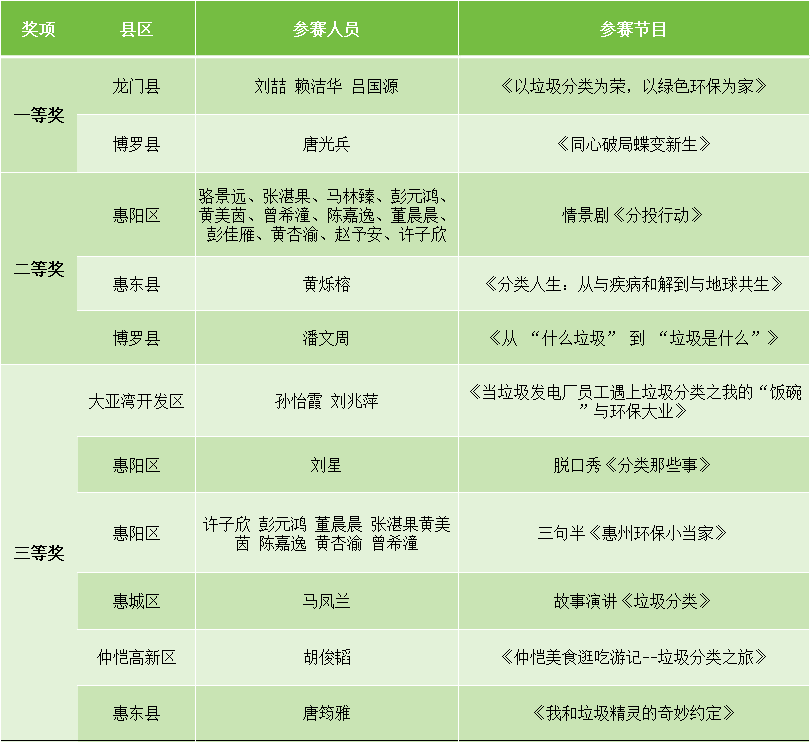 經(jīng)過(guò)激烈角逐,龍門(mén)縣劉喆、賴潔華、呂國(guó)源帶來(lái)的節(jié)目《以垃圾分類為榮,以綠色環(huán)保為家》與博羅縣唐光兵的節(jié)目《同心破局蝶變新生》憑借出色表現(xiàn)榮獲一等獎(jiǎng),另有3組選手獲二等獎(jiǎng),6組選手獲三等獎(jiǎng)。