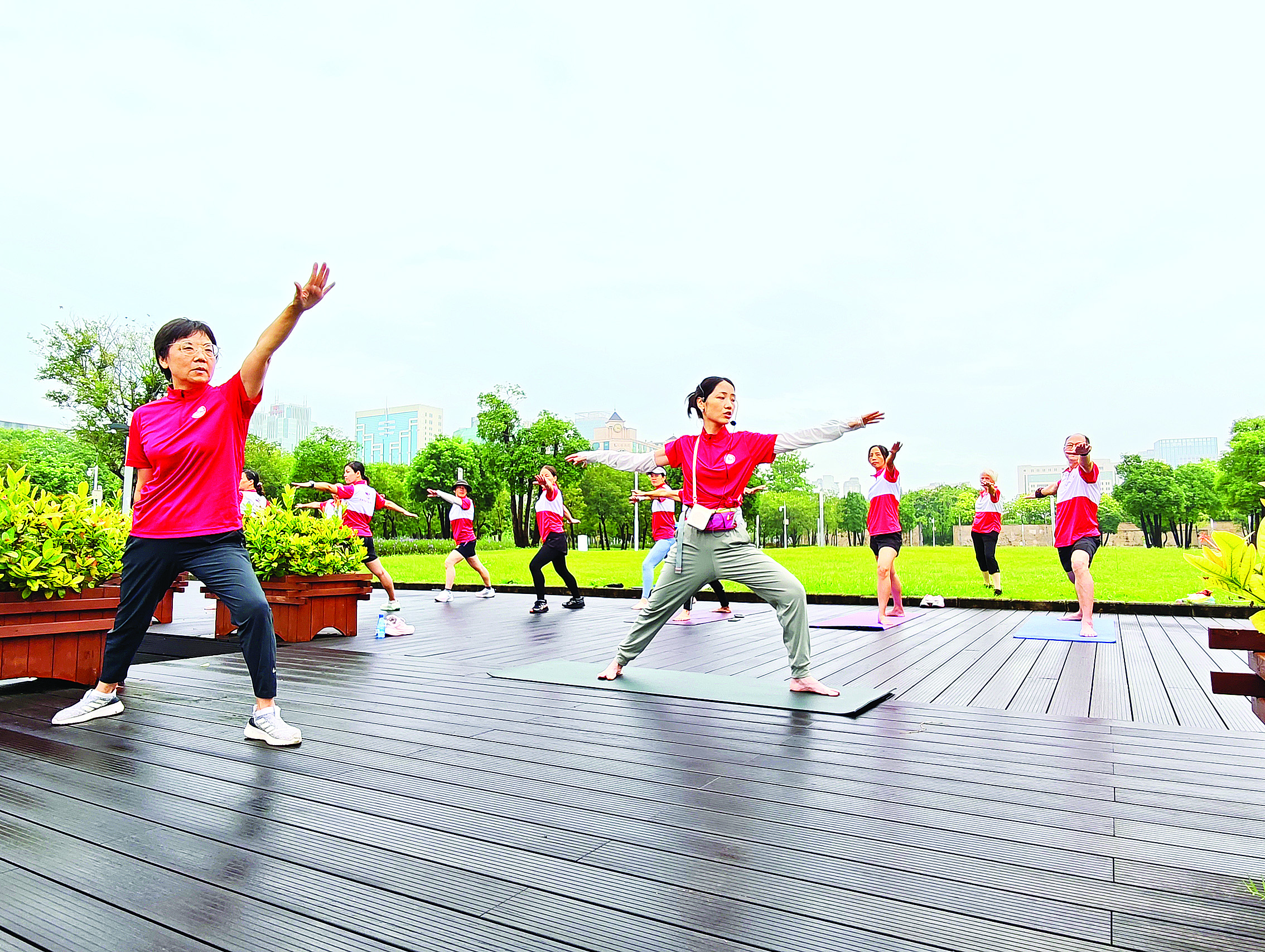 新時代文明實踐(市民公園)撿跑志愿服務隊每周三早上在市民公園開設免費瑜伽課;葜萑請笥浾呦憬鹑 攝